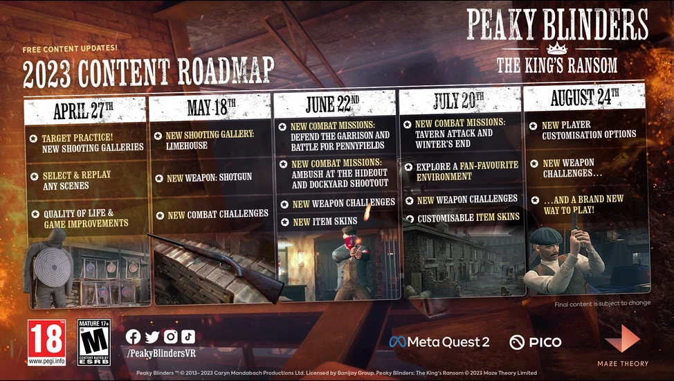 Released last month on Quest 2 and Pico 4, Peaky Blinders: The King's Ransom comes from Doctor Who: The Edge of Time developer Maze Theory. Outlined in a new video, the roadmap brings monthly content updates from April until August 2023. Starting tomorrow, that includes new shooting galleries, replaying any scenes and unknown "quality of life" improvements.