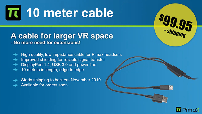 For users who want the largest room scale possible, Pimax is also coming out with a 10 meter cable for $100. This should pair nicely with Valve’s SteamVR 2.0 base stations, which support a 10×10 meter space when four are used.