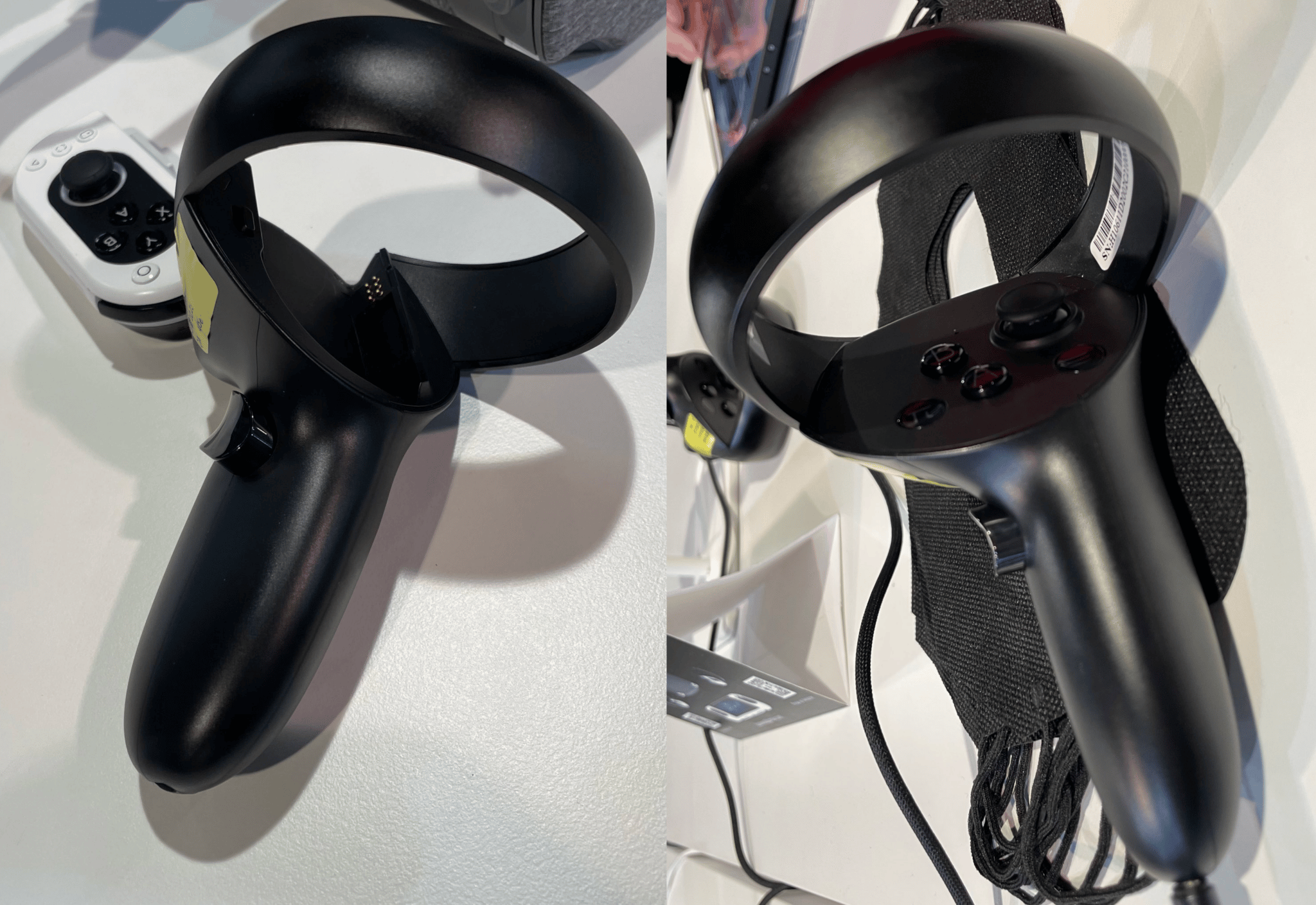 At CES 2023 in Las Vegas we visited Pimax’ booth and asked to test the Portal View VR mode. I wanted to use the controllers shown above mounted in the sleeves so UploadVR could test the input and tracking. While Pimax had controllers at its booth resembling those in the video (seen at left in the photo below), company representatives told UploadVR they weren’t ready for testing in VR. Despite Pimax’ claims of shipping in January, the View VR mode for the Portal handheld was shown with the dedicated Touch-like controllers seen at right in the photo below.