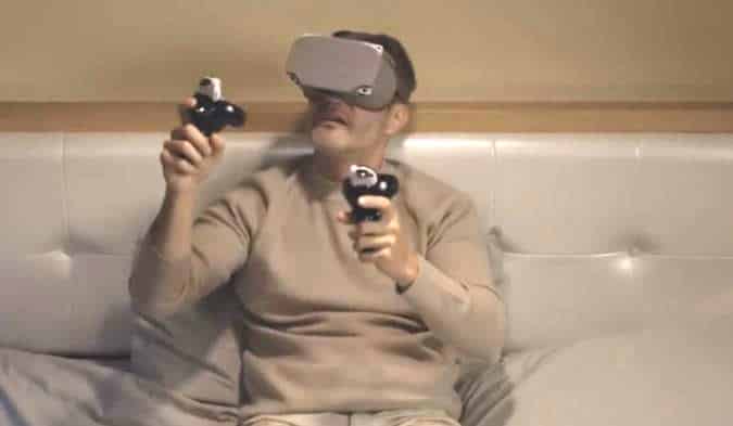 Below is a frame from Pimax’ Kickstarter video showing the full VR system with the handheld controllers slipped into sleeves and the screen slipped into its own head-mounted accessory.