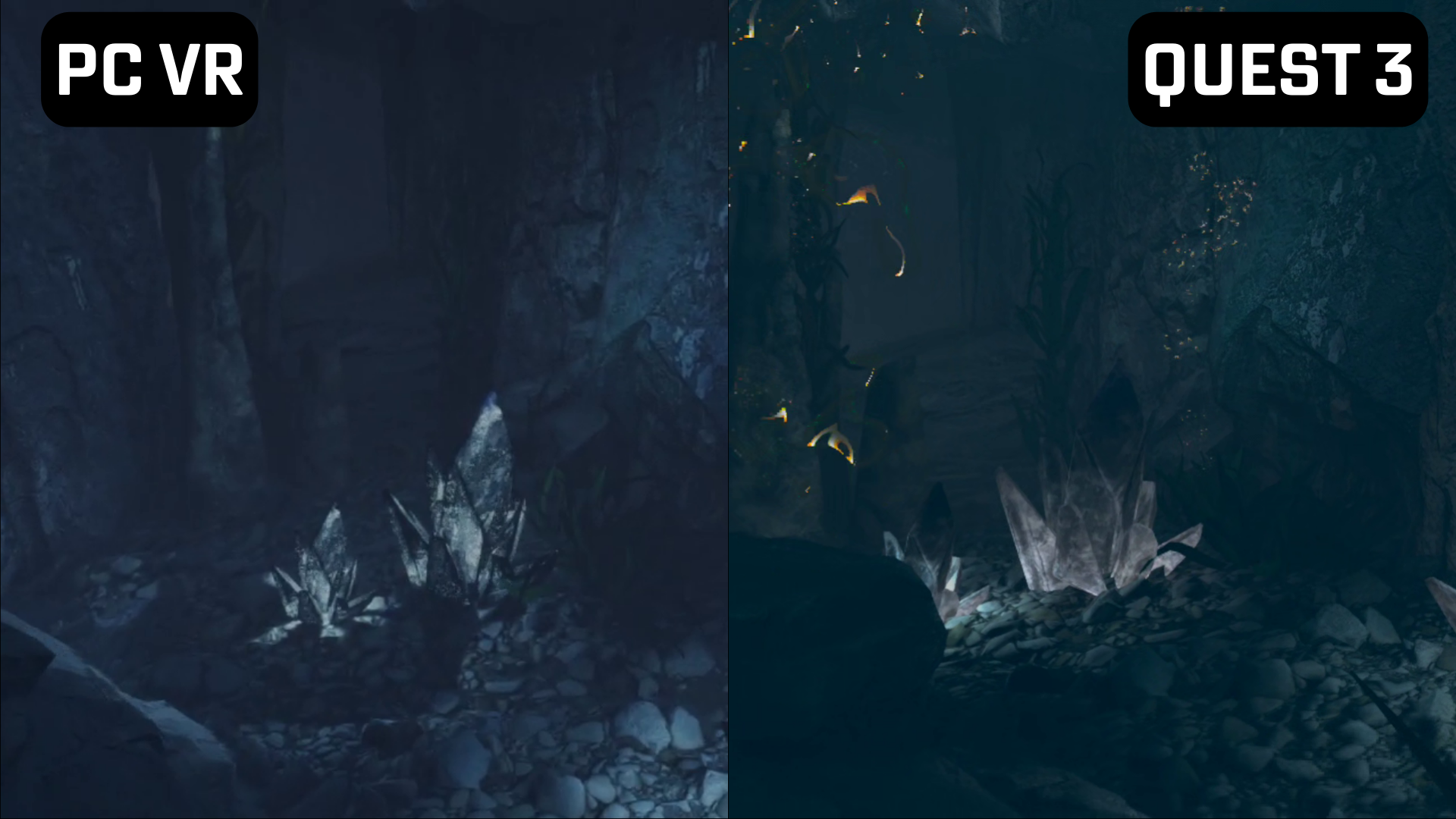 I expected the draw distance looking out to the ocean to be reduced by a heavy use of fog, but that's not the case. The entire area is intact with a surprising amount of detail preserved. Little things, like the dust particles when grabbing a vine add to the overall experience. However, looking out to the horizon caused a major frame drop I experienced in the game, going from 72 to the low 50s. There is quite a bit of texture pop-in, but that was there with the PC version as well (especially underwater) unless the PC graphics were highest setting and even then, the odd rock or bush would still pop into view as you approached it. The level of detail and texture quality on the environment items (rocks, ground, walls, plants) have clearly been reduced, but not to the point of breaking immersion. The skeletons you spend the entire game fighting are more detailed on PC than Quest, but this didn't really stand out until encountering the enemies wearing clothes later in the game.