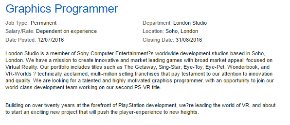 A job listing we’ve found over on PlayStation Jobs confirms as much. The developer is looking for a Graphics Programmer to come and work on “our second PS-VR title”. Few details have been confirmed right now, though the listing states that the new project will “push the player-experience to new heights”. The game will continue to use the studio’s own proprietary engine that’s tailored towards VR. The developer is also looking for a Technical Artist, presumably to also help work on the project, though the listing doesn’t make mention of it.