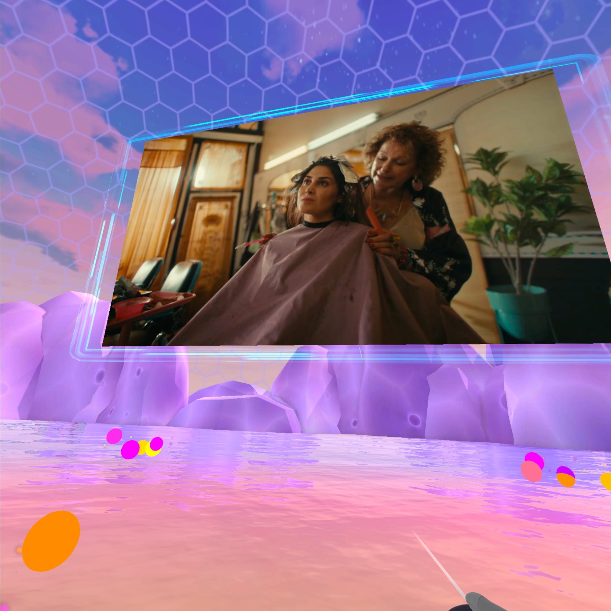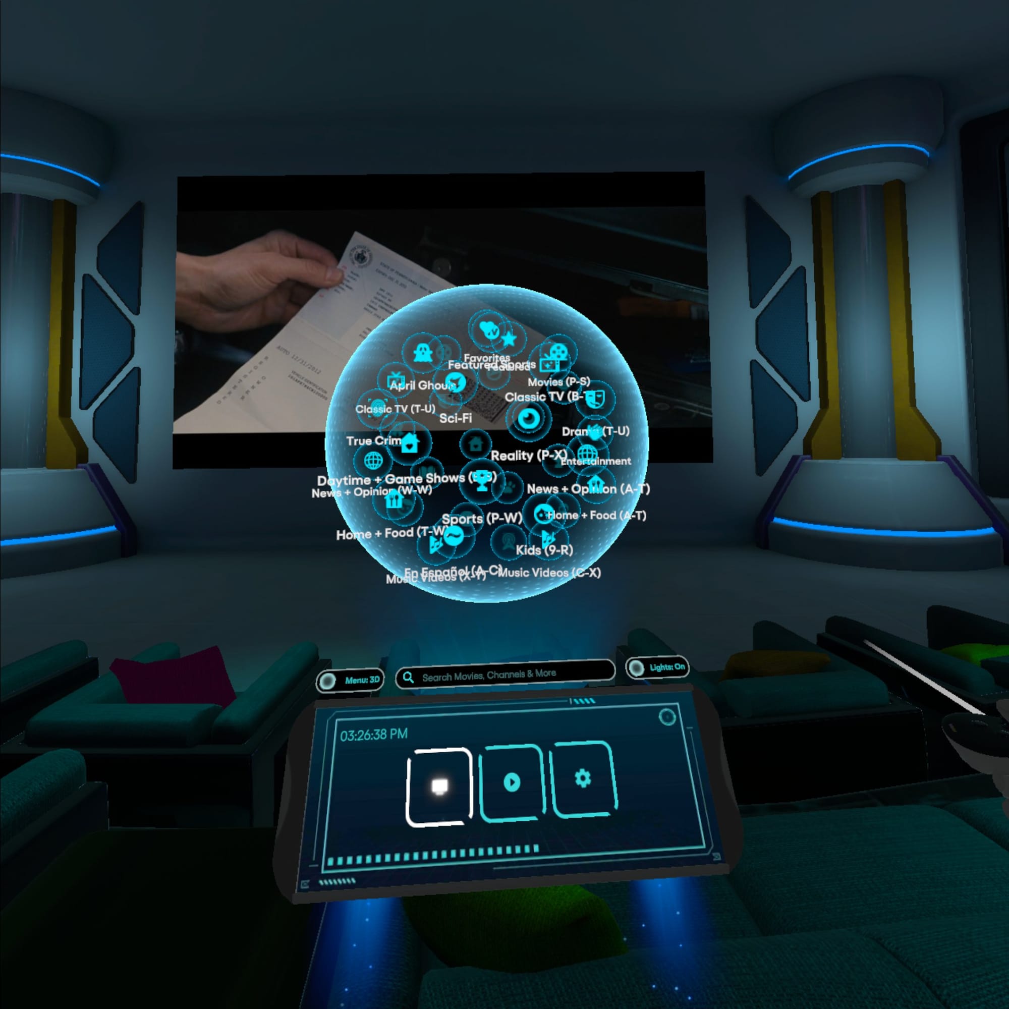 Tapping the left controller button brings up a floating menu that arrives on small hovering “drone” elements in front of you. From there, you can browse channels using a standard 2D list or switch to a 3D globe-style interface.
