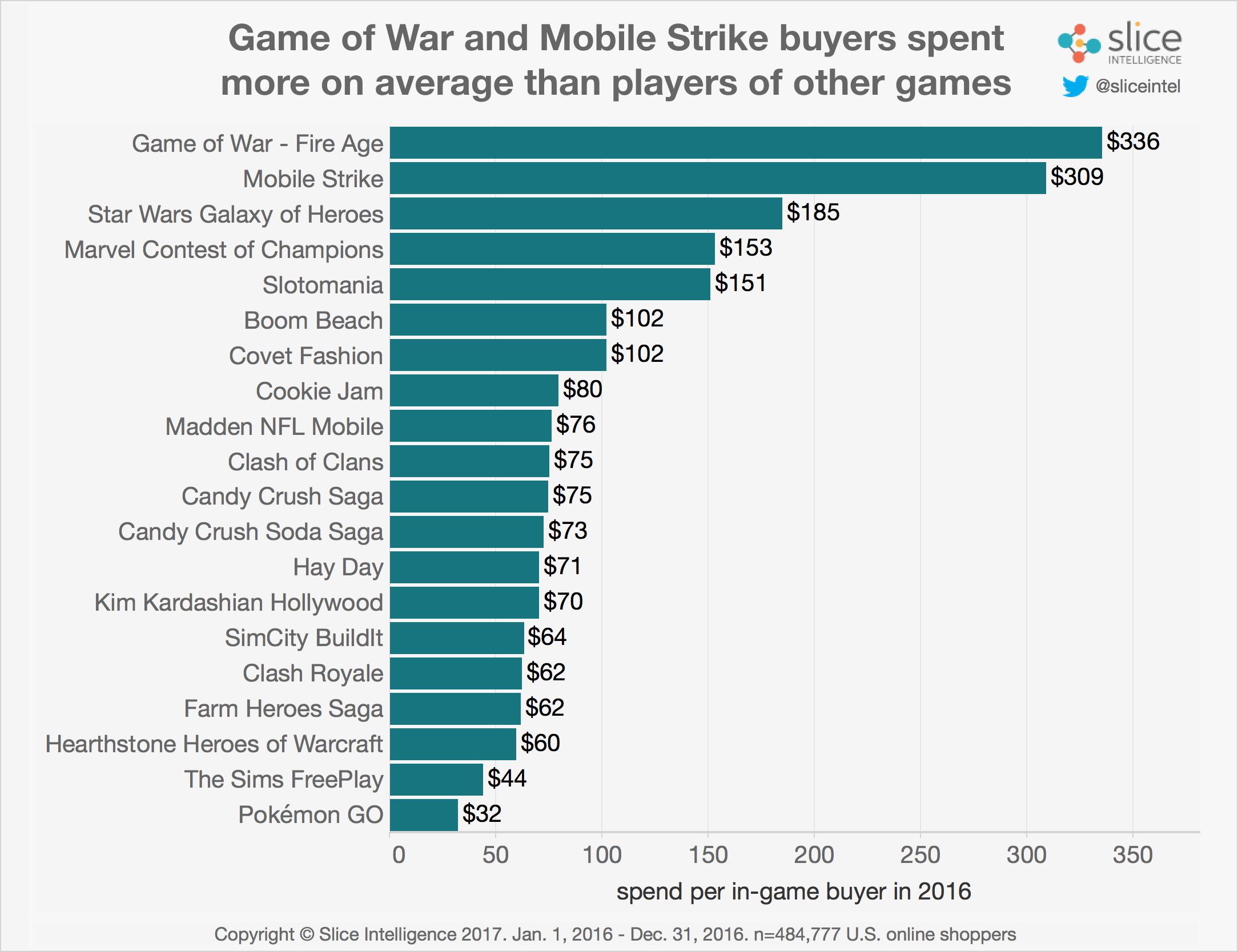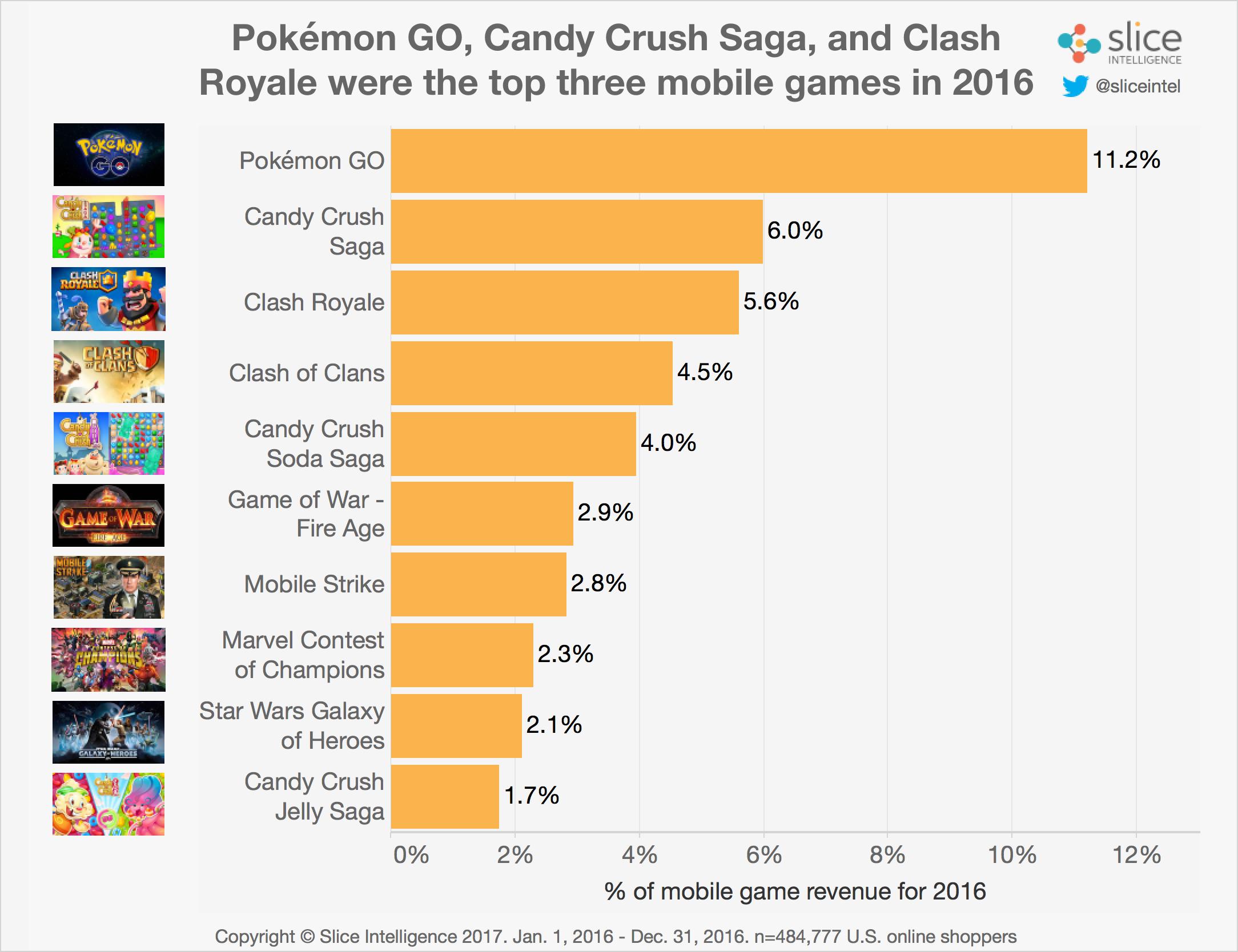 Slice states that Pokemon GO made 86 percent more money than the second best performing mobile game in 2016, Candy Crush Saga, accounting for over 11 percent of mobile games sales. Despite this players actually spent the least amount of money on the app than any other of 2016’s top performing mobile games. On average players spent $32 a year on the game while they could also spend up to $336 on a game like Game of War – Fire Age.