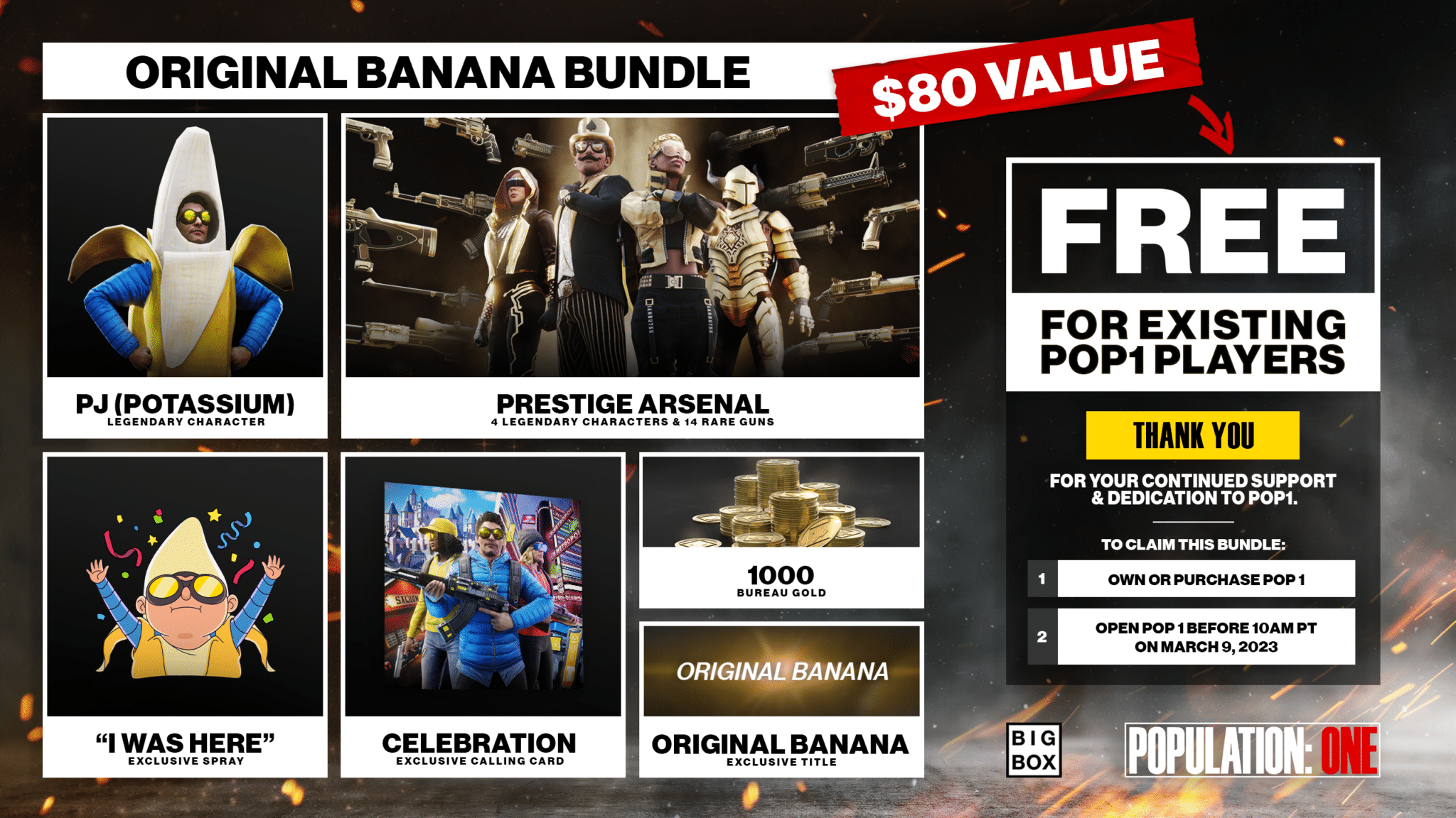After launching in late 2020 for $29.99, Population: One will be free-to-play for everyone on the Quest platform from next week. Existing owners of the game (or those who buy and open a copy before March 9) will receive the ‘Original Banana Bundle’ as compensation, which includes the legendary PJ (Potassium) character, the Prestige Arsenal (four legendary characters and 14 rare guns), an exclusive spray, 1000 gold and more. You can check out the full details in the graphic below.