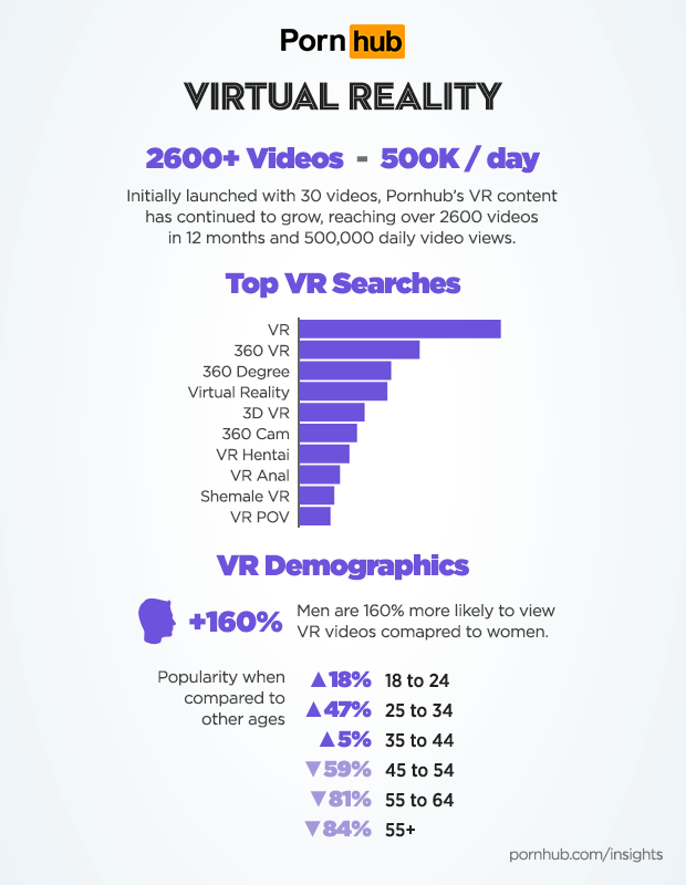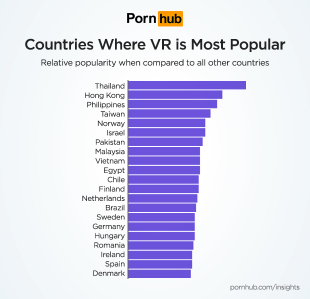 Pornhub’s results also show that men are 160% more likely to watch VR videos over women, and that most people that watch VR content are between 25 to 34 (47% of viewers, to be precise). Thailand is the most popular country for VR content. In fact, the USA doesn’t even rank on the list of 21 countries that watch these videos the most.