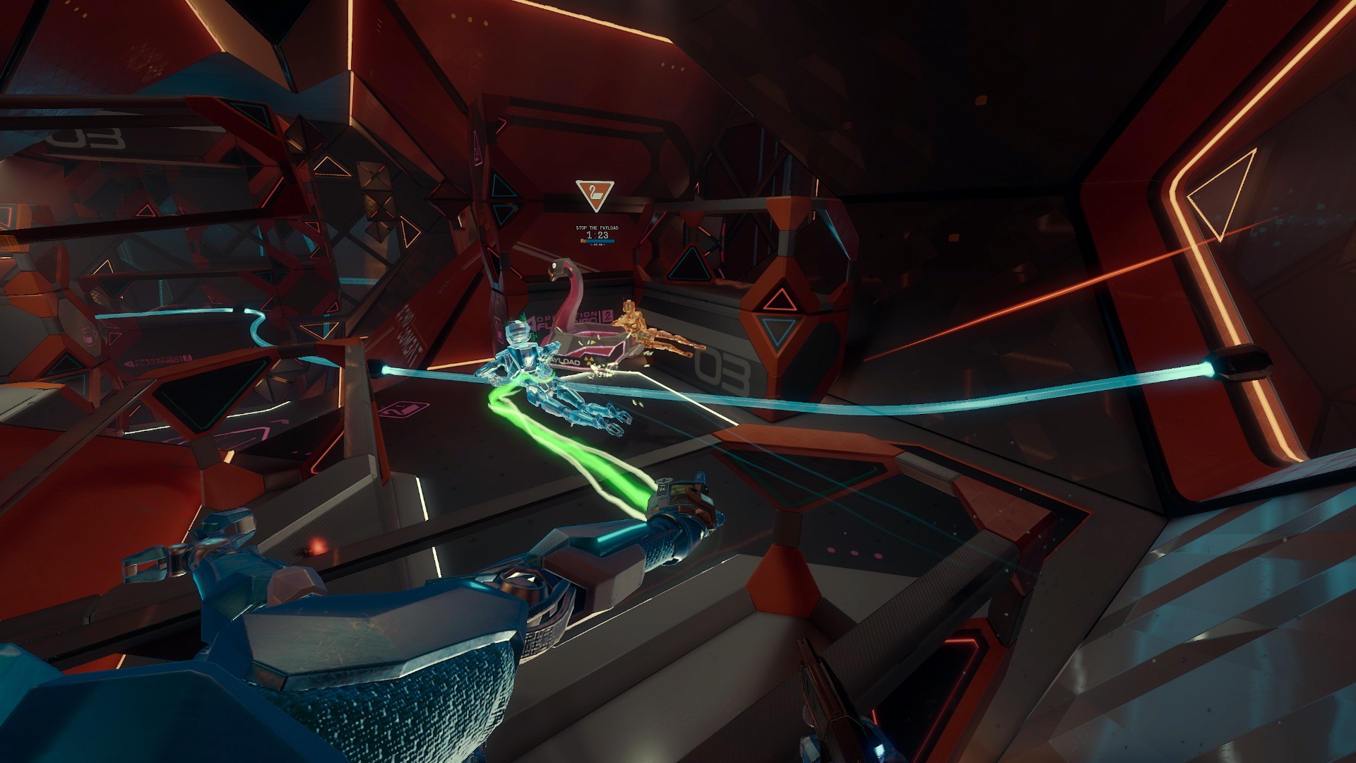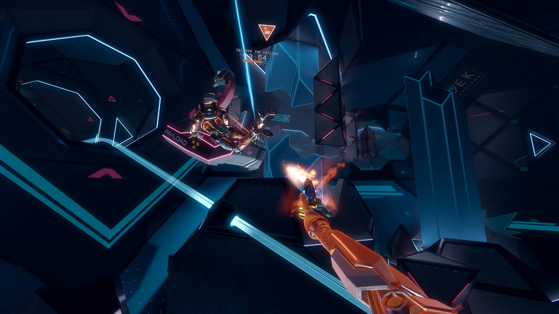 At first on the Attacking team I tried to just hold onto the payload and ride it to the next checkpoint, using its base as cover. But wait — this is a zero-G VR shooter, not a 2D shooter like Overwatch — that’s not going to work. Enemies easily flew up underneath me and shot me from below, or sniped my dangling legs below the payload.