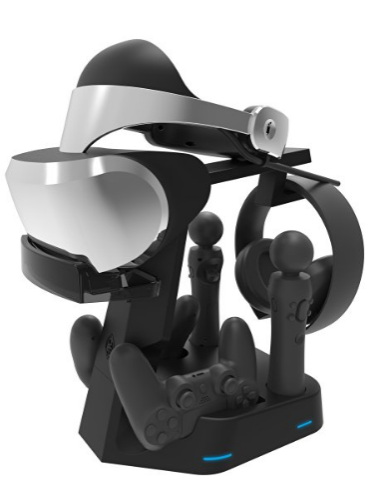 This, however, appears to be the cheaper and seemingly more feature-complete $34.99 product from Collective Minds. Not only does this house all of the same accessories as BD&A’s stand, but it’s also got room for an extra DualShock 4 and evening a gaming headset (as in for ears, not eyes), with a USB port for charging. And there are LED charge indicators on the bottom too.