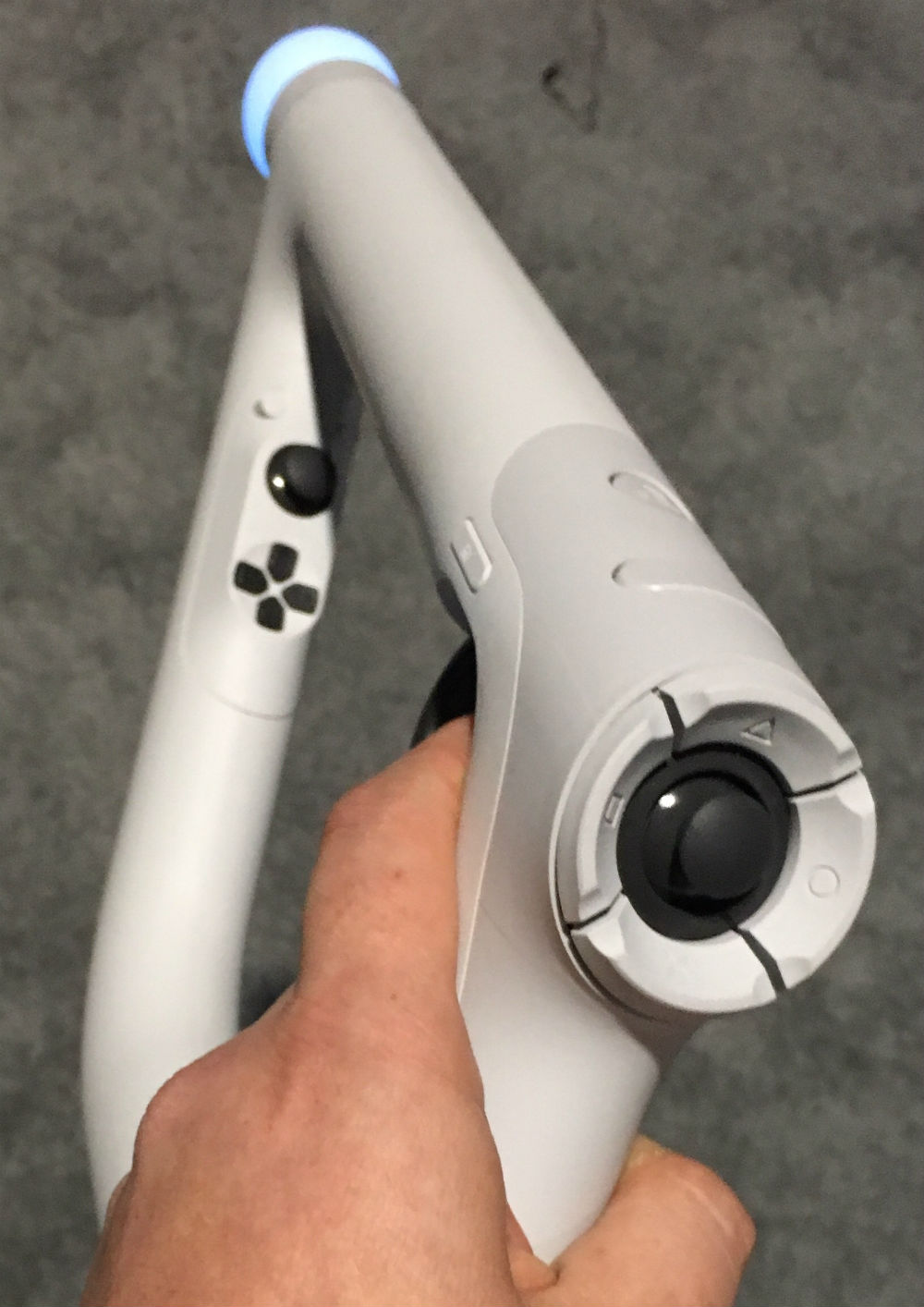 While guns incorporating the PlayStation Move controllers already exist, they use multiple parts. The PS VR Aim Controller is a single integrated piece with a tracking sensor where the end of the barrel should be. It includes analog sticks near your thumbs, a trigger and an assortment of buttons at various easy-to-reach spots.