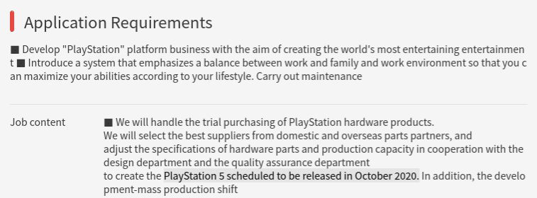 Original Story: The listing, flagged by Twitter news account, Nibel, is in Japanese. Based on a Google translation, it’s for a role in procuring components for manufacturing. Specifically, the role is concerned with the PS5 which, the listing states, is “scheduled to be released in October 2020.”