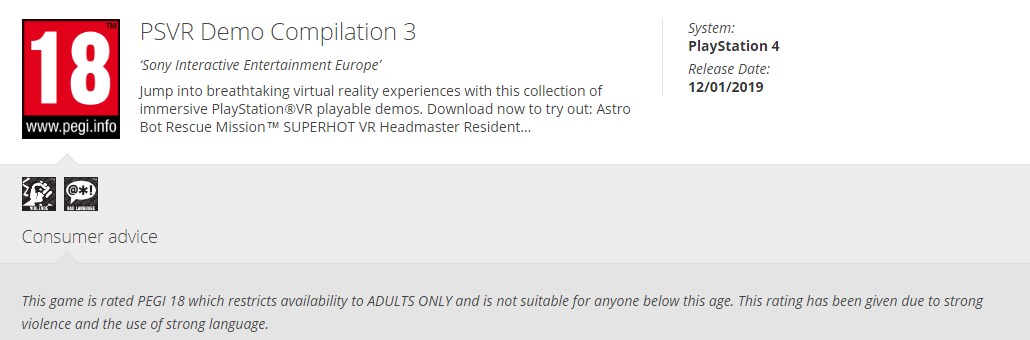 That is according to Ostrog, which claims to have spotted an ESRB listing for ‘PSVR Demo Compilation 3’. We couldn’t find the listing ourselves but the site apparently took a screenshot that you can see below. There were rumors of a new demo disc late last year but, when we asked Sony about it, the company told us it didn’t comment on rumor and speculation.