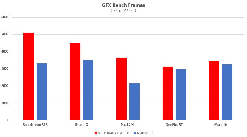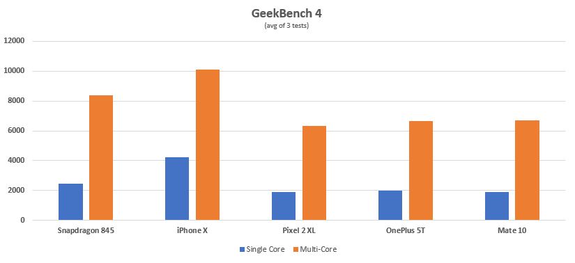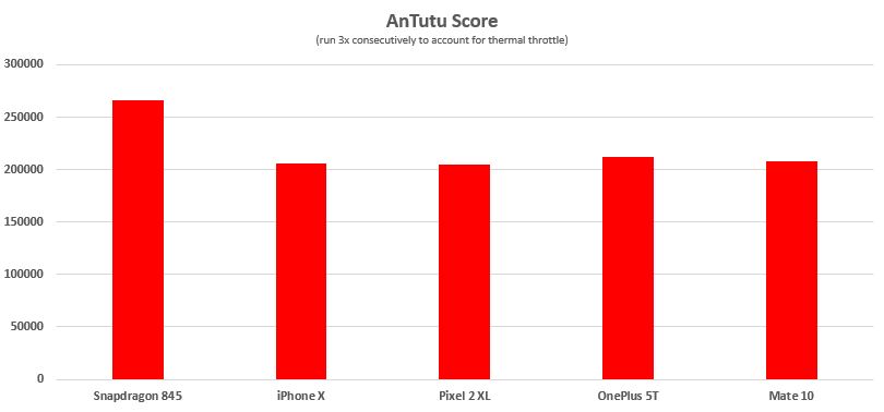 As you can see from AnTuTu, the Snapdragon 845 is approximately 30% faster than the previous generation and the iPhone X. This has a lot to do with the fact that AnTuTu gives graphics performance a considerable amount of weight, but also CPU and other functions including UX and memory. In fact, the Snapdragon 845 development device that Qualcomm provided for testing has slower memory than some other commercial devices and is around the same form factor as the other devices tested rather than a thick development device that has excessive cooling. More on cooling later.