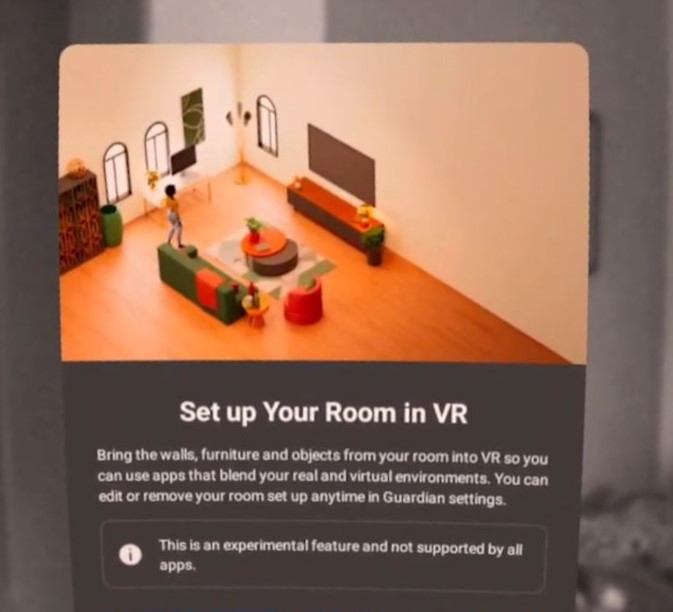 “Bring the walls, furniture and objects from your room into VR so you can use apps that blend your real and virtual environments,” a dialog for the feature notes.
