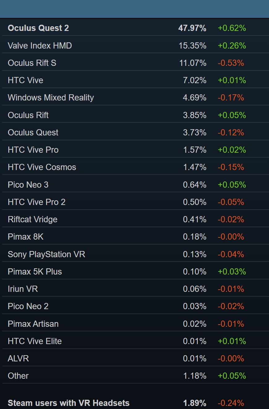 The usual incremental changes occurred on other platforms: the Oculus Rift S continued its steady decline down to 11.07%, and HTC saw minor wins and losses across its hardware offerings. In total, 66.62% of VR headsets on Steam are Meta-made.