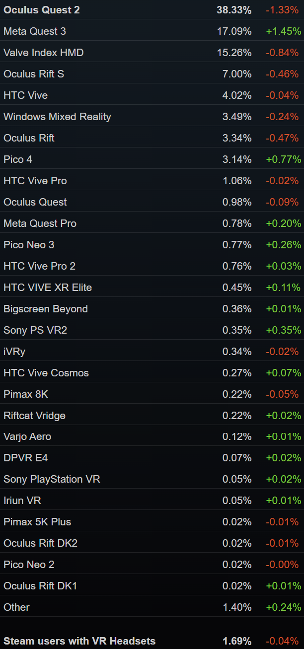As of August 2024, Quest 3 is now the headset of choice for 17% of SteamVR users, and Meta and Oculus headsets now have a usage share of over 67%, around two-thirds.