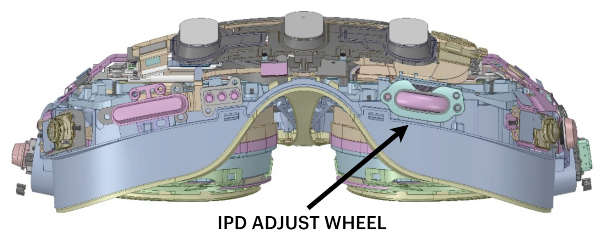 The bottom angle appears to show a scroll wheel, presumably for stepless lens separation adjustment. Quest 2 only offers three preset lens separation distances, so the image could be slightly blurred for wearers with an IPD (interpupillary distance) in-between the three options.