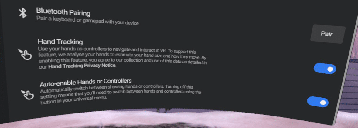 The option is enabled by default if you’ve enabled Hand Tracking. We’re not quite sure why you’d want to turn it off, but you can find it in the ‘Experimental’ tab of the Settings if you do.