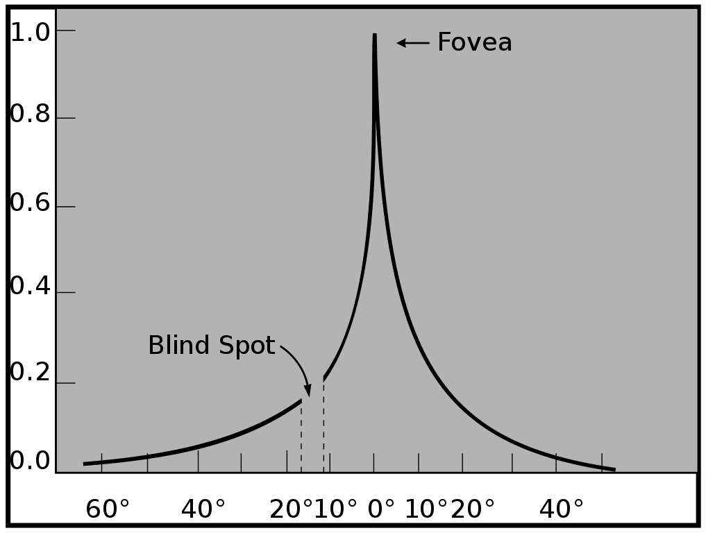 You don’t notice the lower resolution in the periphery because the human eye itself can only see high resolution in the very center – the fovea. This is why you can’t read a page of text without moving your gaze. Believe it or not, that foveal area is only around 3 degrees wide.