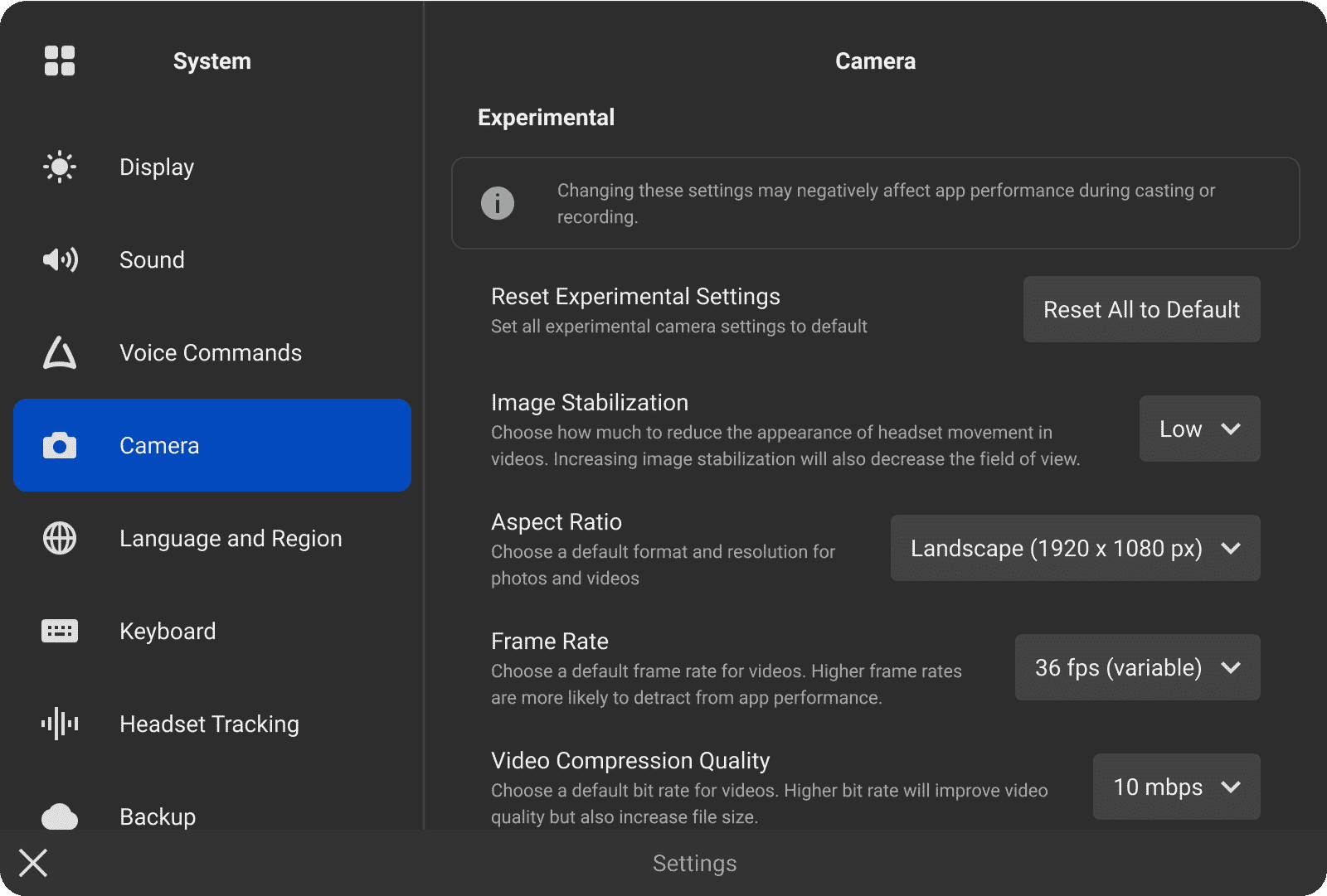 The menu below explains some of the trade-offs to consider, with higher image stabilization settings reducing shaking inherent to head-based video recording at the cost of reduced field of view in the resulting video. Choosing a higher frame rate, meanwhile, could “detract from app performance” while a higher bit rate on the compression settings will increase file size.