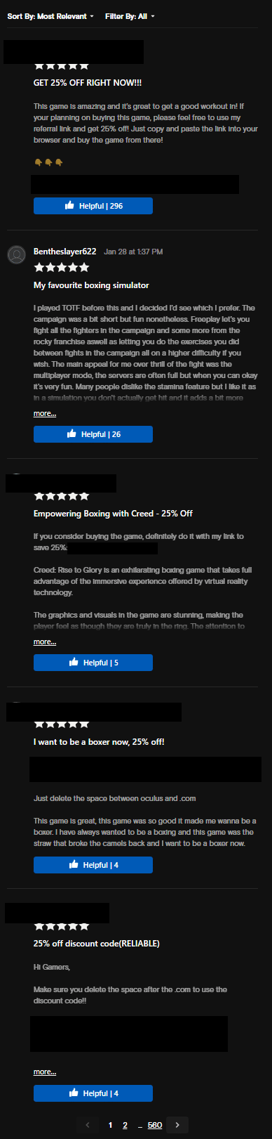 Posts listing store credit referral links seems to have overtaken the most visible areas of the reviews system on many Quest store pages. Meta “advocates” leave five-star reviews marked as “helpful “by others. The page system lists those reviews first and effectively turns those posts into discount ads on Meta’s own storefront.