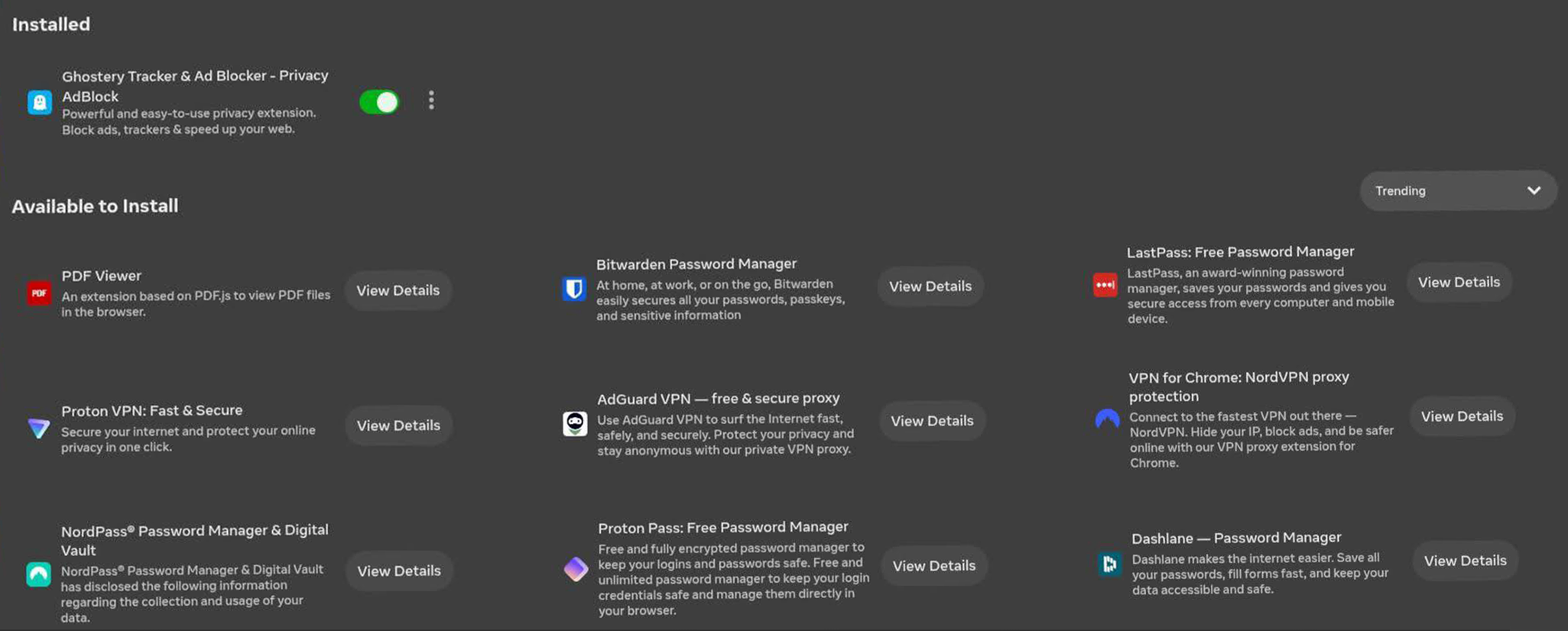 For most people, Meta's web browser currently has one first-party extension, a PDF viewer, and one third-party extension, the LastPass password manager. It shipped last year.