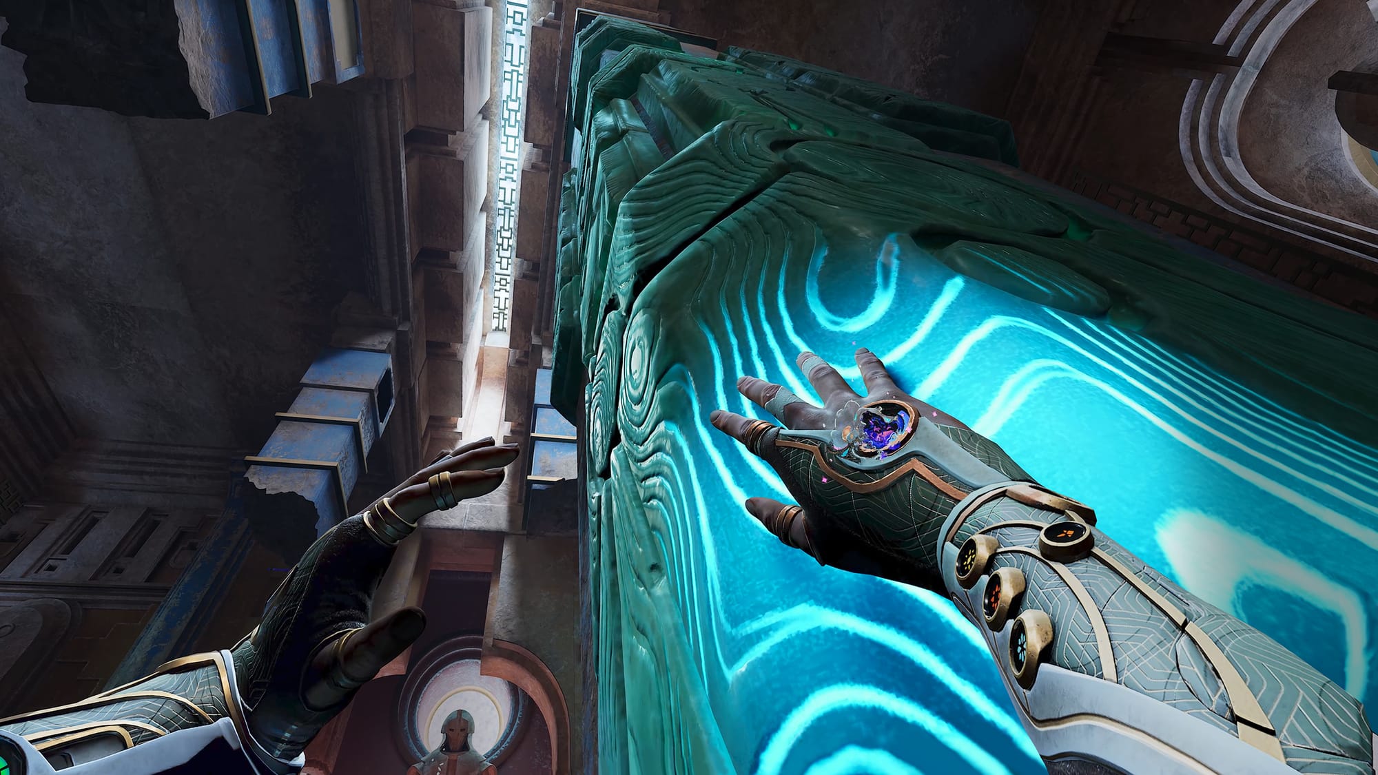 There's great physicality as you explore this beautifully realized world, usually through climbing. When some ledges are unreachable (no pun intended), thrusting your arms down or sideways launches you to make those gaps. Sprinting requires pressing down the left thumbstick, though jumping mixes pressing a face button with swinging your arm upwards. Everything quickly becomes second nature; no convoluted gesture-based inputs to worry about.