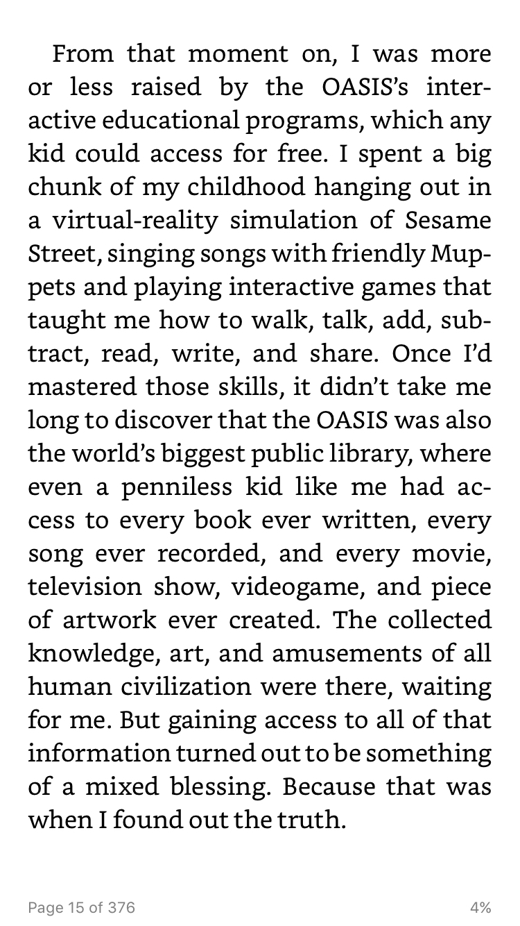 Opinions are overflowing on my Twitter feed from people who have thoughts about both the book and film, but what hooked me on the story was its believable description of the OASIS, its appeal as end point for virtual worlds, and how it operates. Unlike The Matrix, which is a virtually inescapable dystopian virtual world, you’re free to leave the OASIS whenever you want. For Watts’ generation, though, the virtual world is better in every way from a world left with too little food, too few jobs, and too many people.