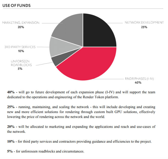 A 10-page document outlines the plan for Render Tokens over the next year, with a pie chart breaking down how they plan to spend the $134 million they hope to raise after the sale of the tokens kicks off on Sept. 19, with 40 percent planned for the build-out of the following four technology phases: