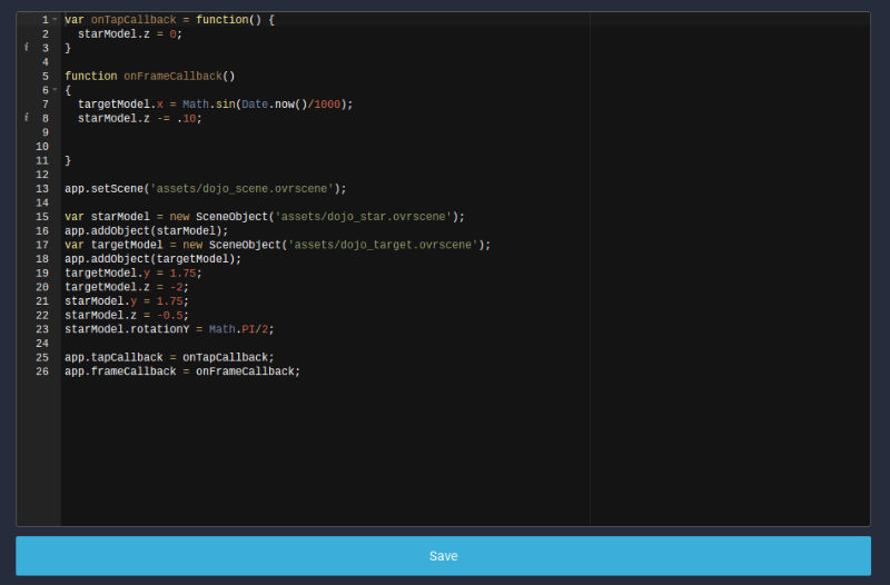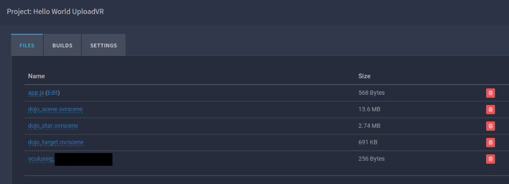 In roughly 10 minutes I used his website to upload a couple pre-made 3D models formatted for Oculus — a dojo environment, a ninja star and a target — combined with 26 lines of javascript. Wrapped together with an easy-to-get signature file required by Oculus that allows the game to run on my Gear VR — I hit “Create New Build” on the Renderloop website and a few minutes later my app was ready to download.