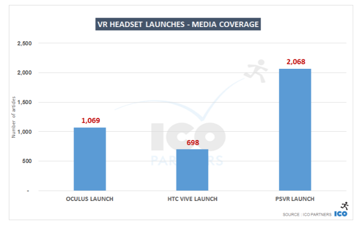 According to the report, for example, PS VR had 2,068 articles written about it in the 48 hours around the product’s official launch. That’s nearly double the 1,069 written about the Rift and just under triple the 698 written about Vive in their respective launch windows. ICO hasn’t shared how it gathered this data, but we’ve reached out for clarification. The report, however, attributes Sony’s experience with PR in helping to spread the word about PS VR.
