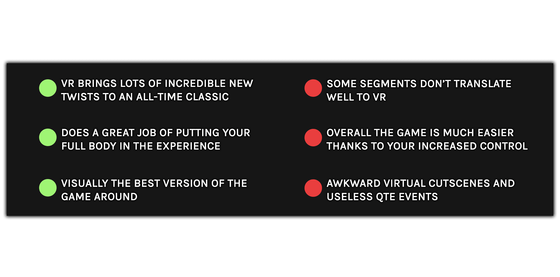 Resident Evil 4 VR is an incredible, if not definitive take on an all-time classic. There are a lot of rough edges to this port like the constant cutting to virtual screens, lack of spatial audio and certain combat encounters that simply don’t translate well to VR. But, for every moment of Wii-waggle boulder dodging or tarnished memories of once much more demanding boss fights, developer Armature mines gold elsewhere. Whether it’s the brilliantly redesigned puzzles, the slick satisfaction of pulling off headshots with careful aim or simply taking in this world of terror from a fresh new angle, there are a lot of reasons to relive the horror. I suspect it’s best enjoyed as a novel way to revisit one of the all-time greats than it is to approach fresh but whatever your circumstances, you’re bound to enjoy the ride. Games like The Walking Dead: Saints & Sinners might be the future of VR, but Resident Evil 4 is a welcome reminder that it’s well worth looking to the past too.