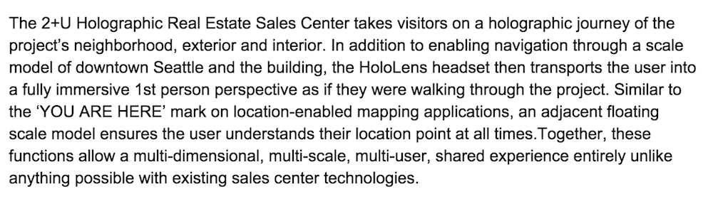 Riesenbeck: In our field, being able to see something before it has been built, visualizing the unbuilt environment, is critical. Typically, we would use renders, animations, and dollhouse models to fulfill our clients needs. Now, with new technologies such as VR and AR, we can give our client the ability to step inside their projects, years before they will be built, and this just blows people’s minds. Especially with HoloLens, where we can have multiple people viewing a hologram of their building together, collaborating on changes, and traveling through a shared experience. It’s game changing for us.