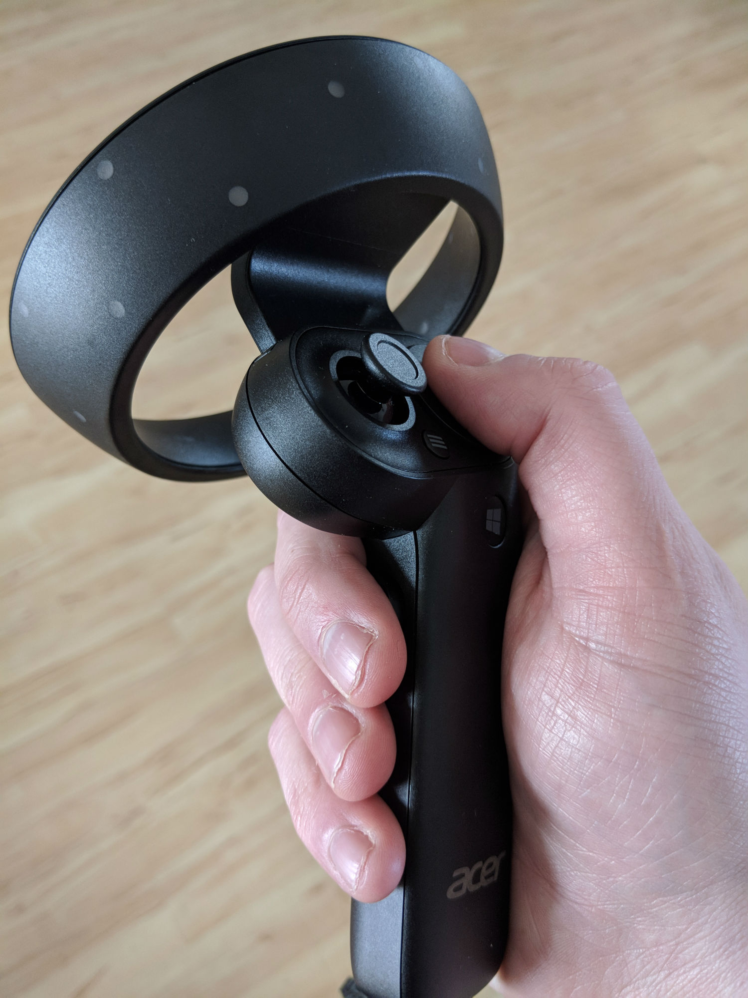 There’s still a screen-door effect (where it looks like you’re seeing the virtual world through the squares of a screen door) with the Acer display, but it doesn’t appear dramatically worse or better than on a Rift or Vive. I didn’t notice any god-rays (where light can seem to pop through the clouds in a distracting way) nor did I notice glare from the Acer lenses, which is the subject of some criticism on the Rift. We’ll have to wait and see how Samsung’s Odyssey HMD compares to the displays inside the Acer as the Samsung headset features an OLED display with the same inside-out tracking.