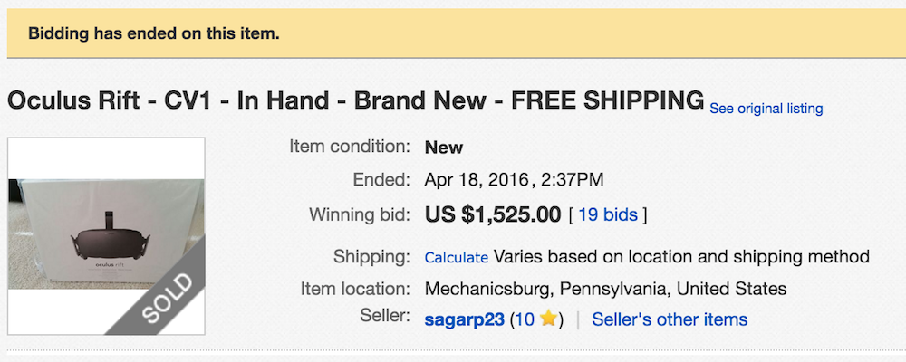 For example, one particular Rift headset – being sold by a user named sagarp23 – recently closed its auction at the eye-popping price of $1,525.