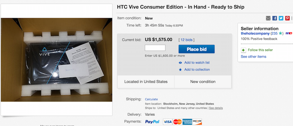 On the Vive side of things, the story is the same. At the time of writing, a consumer version Vive, in hand and ready to sell, is currently sitting at $1,575 (a 96 percent price increase) with four hours left on its auction.