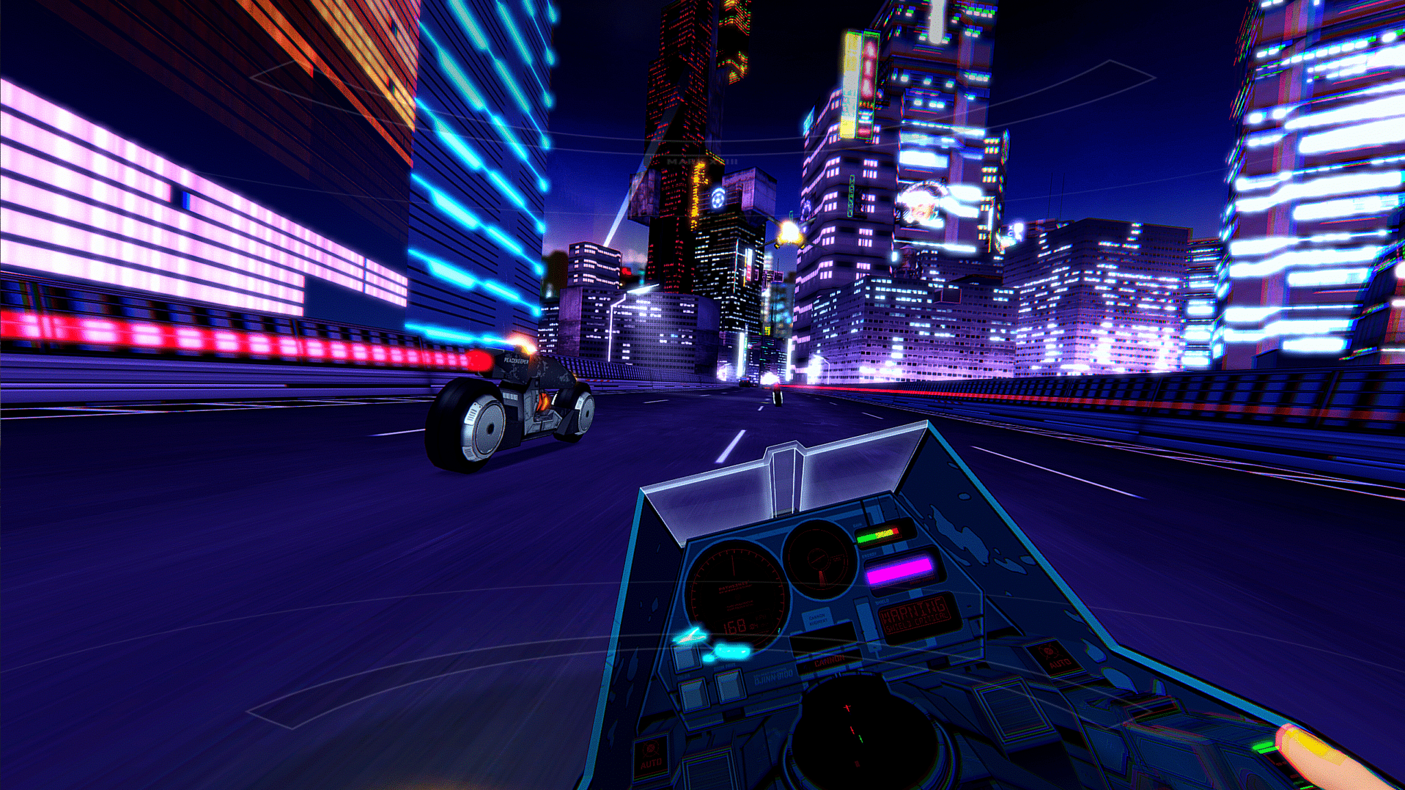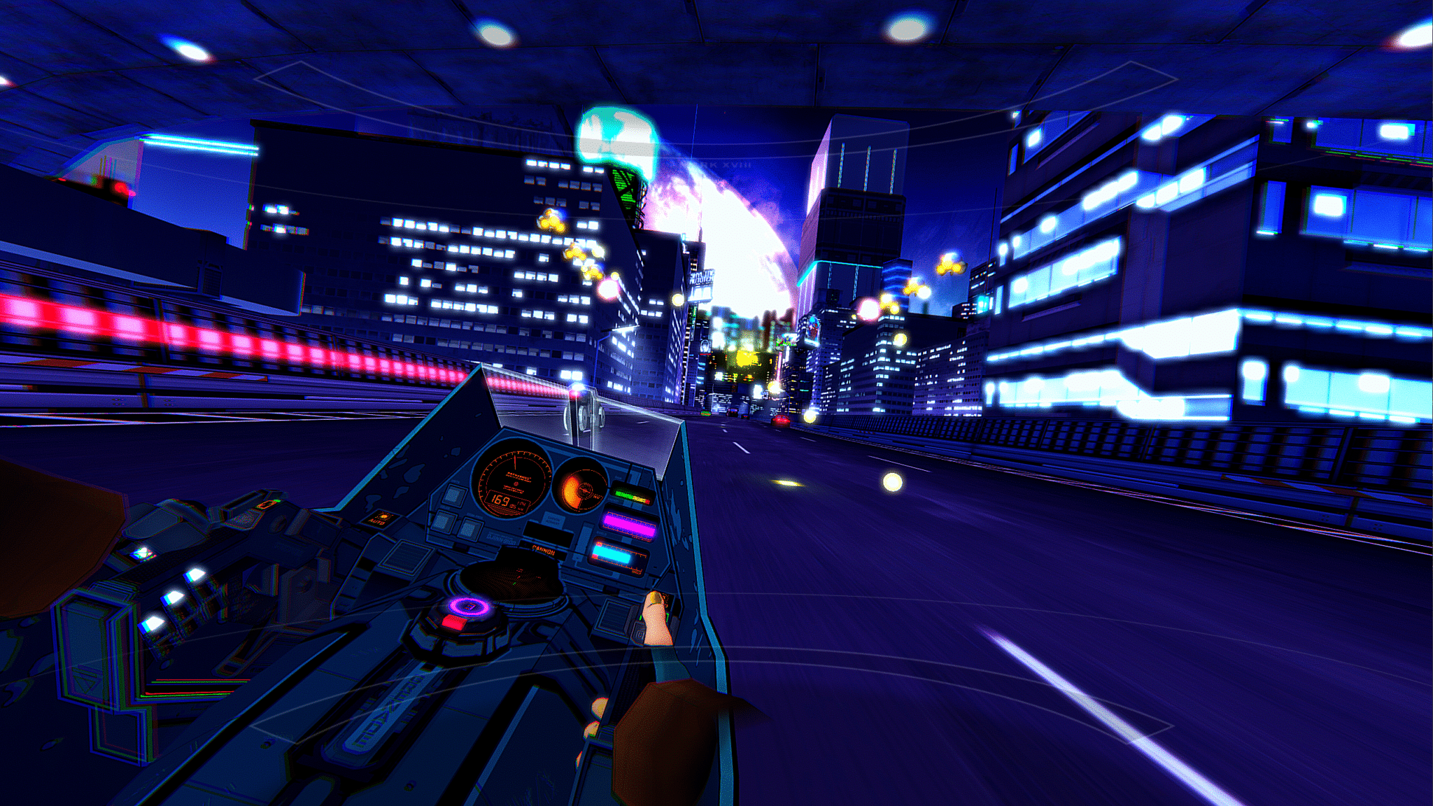 “RUNNER is an arcade-inspired VR driving action game. Players take on the role of Mina, a rogue mod-courier at the center of a massive city-wide pursuit. Beginning in the heart of Presidium, the neon-drenched capitol of the mining colony moon N-351, Mina’s only means of escape is the “Thoroughfare,” a massive highspeed expressway that snakes through the entirety sprawling colony complex.
