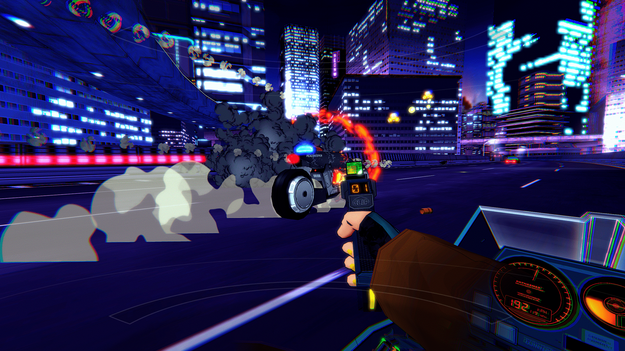 Obviously the in-game visuals don’t look exactly like an 80s-anime, though. The art style is still very cel-shaded and evocative, but it seems noticeably brighter. It looks like the game takes place while you ride down long stretches of highway on your motorcycle while fighting off bad guys. I want to once again stress the clear Akira influences here, all the way down to the notably red motorcycle, accented by big, round Tron-style wheels.