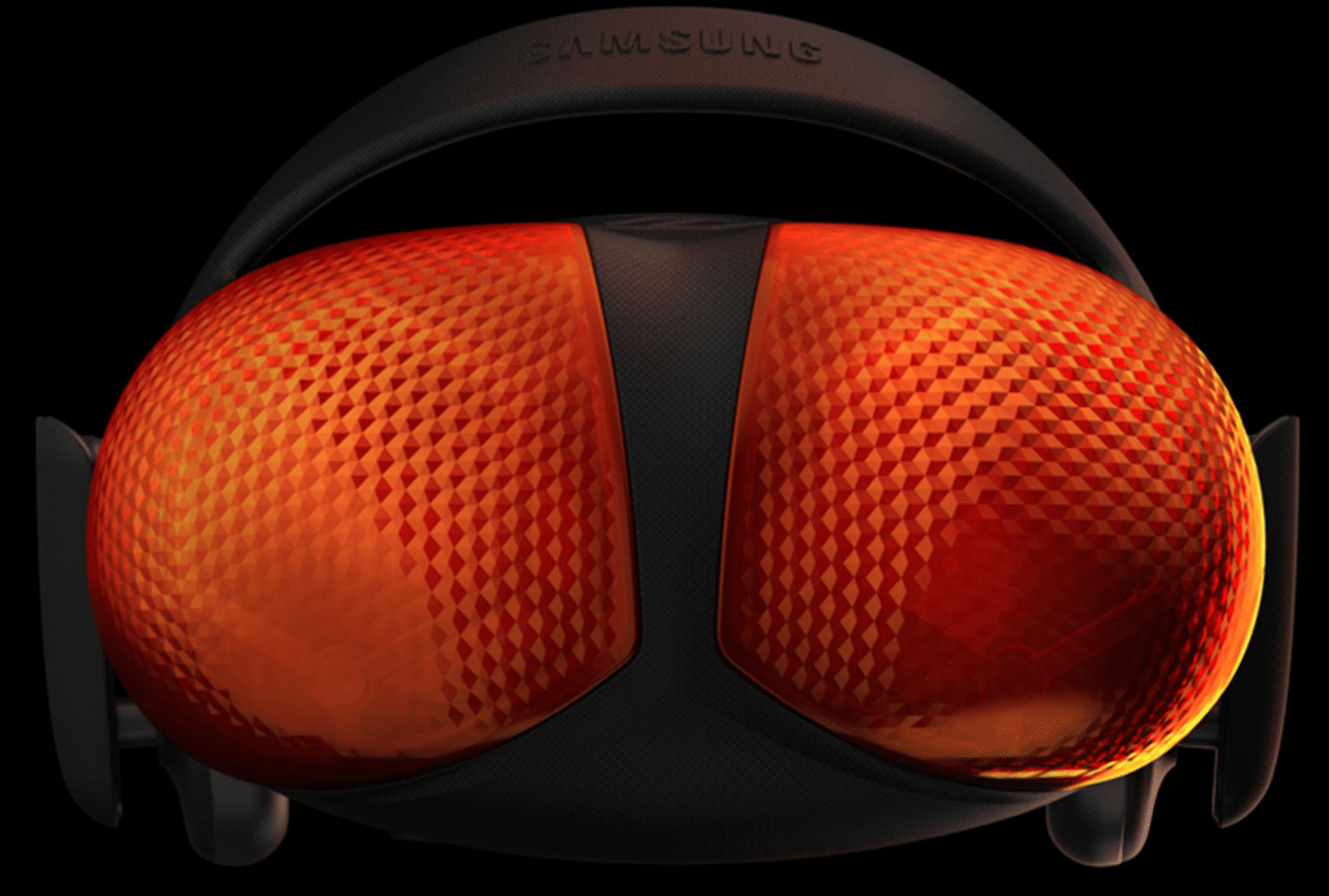 The patent contains a design drawing sketch as well as two full color renders from Samsung. The images show two bulbous semi-transparent hemispheres on each side of the front. In one rendering they are blue, while in the other they’re red.