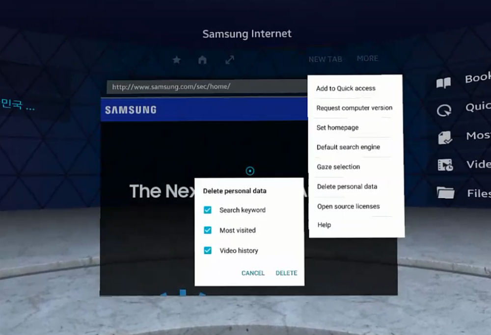 In the coming weeks Samsung is launching an update to its VR Internet browser with key new features. Paired with the upcoming Note 7 and its ability to connect to USB thumb drives, the new browser will let you pick videos to watch in VR from a drive plugged into the Gear VR. Also, while still in VR, you can clear your viewing history.