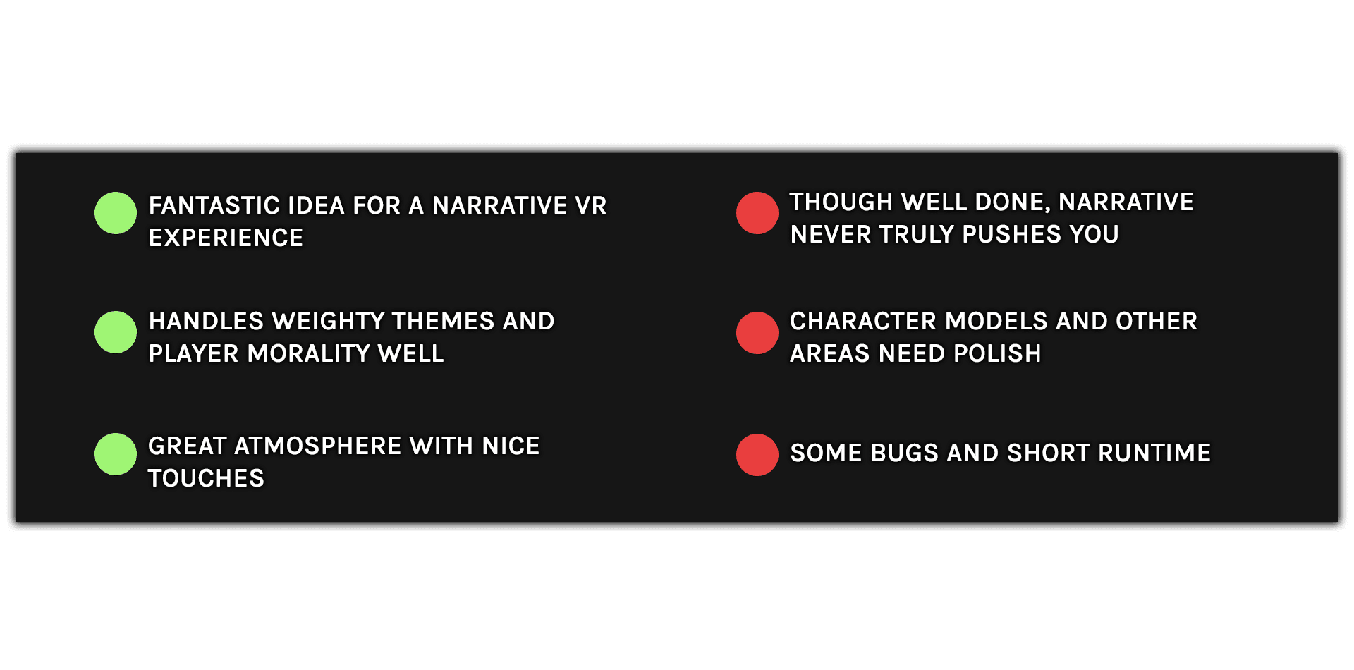 Sentenced’s weighty themes do a fascinating job of conjuring up conflict within, even if it only ever digs just below the surface of your conscience. It’s an endurance test more than it is a complex set of ethical conundrums and, in that, it’s a uniquely engaging VR experience. Come ready to fulfill your duties but wary of the limits authority will push you to, and you might find Sentenced challenges you in some surprising ways. Not for everyone, but a bloody treat for those willing to take up the burden.