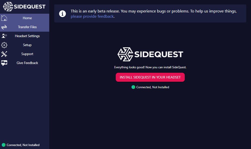 When you open up the Easy Installer, it should automatically come up with a button to ‘Install SideQuest In Your Headset’ (pictured above).