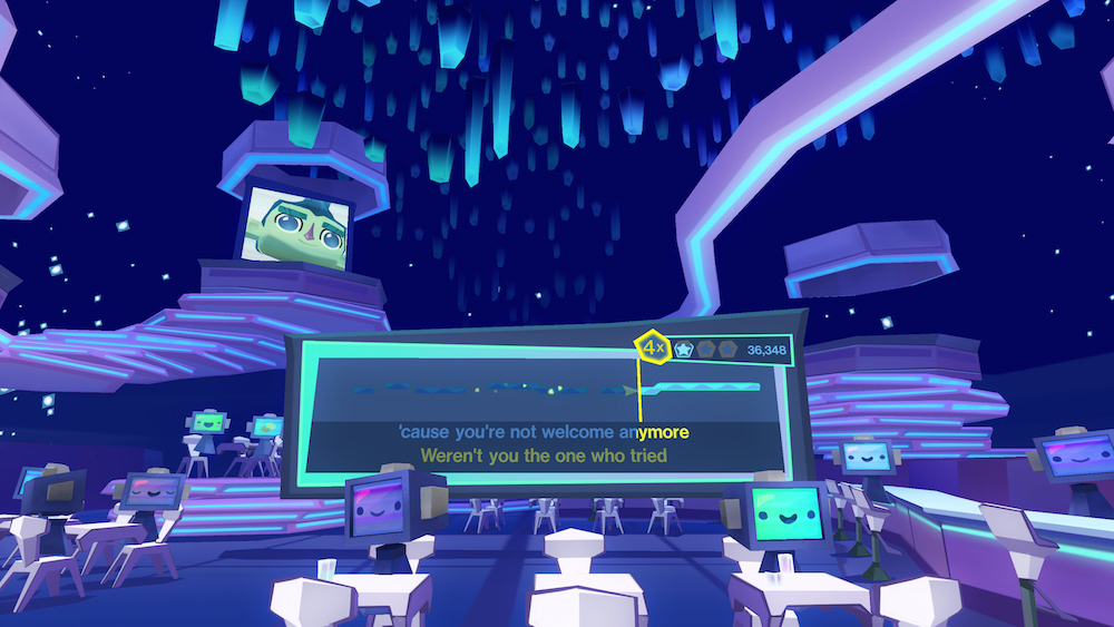 SingSpace is designed to let you croon your favorite hits in an immersive digital karaoke parlor while a mass of robot onlookers react to your performance in real time. The game uses a version of the now familiar Harmonix line-and-arrow system to gauge your vocal performance. Well executed tunes will earn the admiration of the robots in the crowd and failure will lead them to lose interest in you all together.