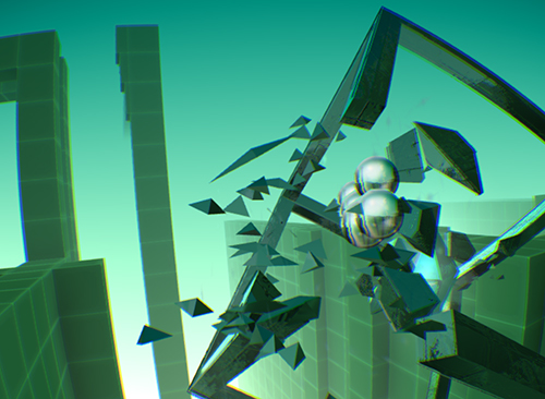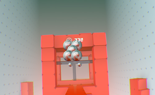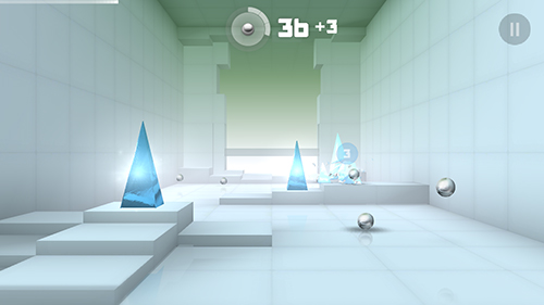 In Smash Hit on mobile, the player taps the screen to unleash a ball that arcs through space in front of them. The goal is to hit crystals that shatter like glass. Successfully hitting each crystal arms the player with more balls to toss. Hitting enough of the crystals in a row eventually gives the player up to five balls to launch with just one press, making it easier to hit the targets in more challenging areas. Eventually dozens of balls are being tossed around the play area and glass is flying everywhere. The player moves in a straight line toward the horizon with breakable objects entering their path. Colliding with one of these objects resets the player down to a single ball. Game over if the player runs out of balls.