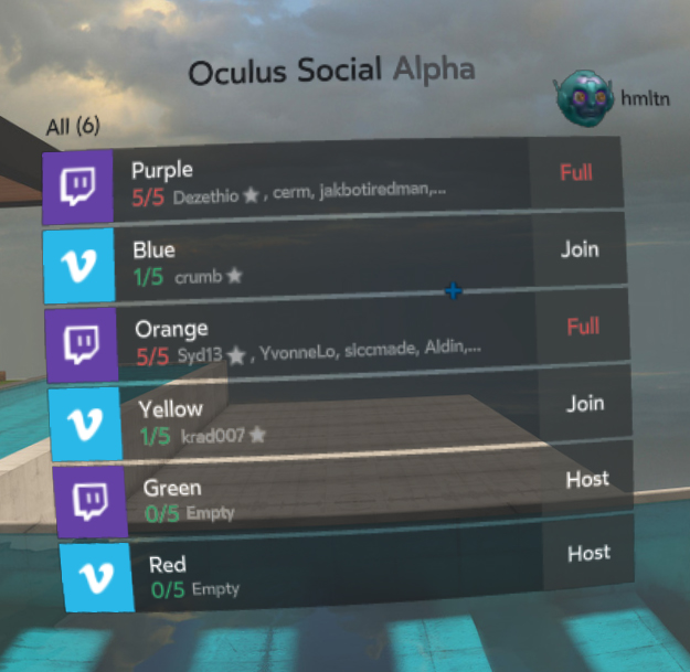 The social VR features launching in a public testing phase from Oculus allow five people to watch a Vimeo or Twitch video together in a shared virtual home theater on the Gear VR. I just emerged from a session watching videos together in a room with CorvusVR, Will Mason and a guy named Steve.