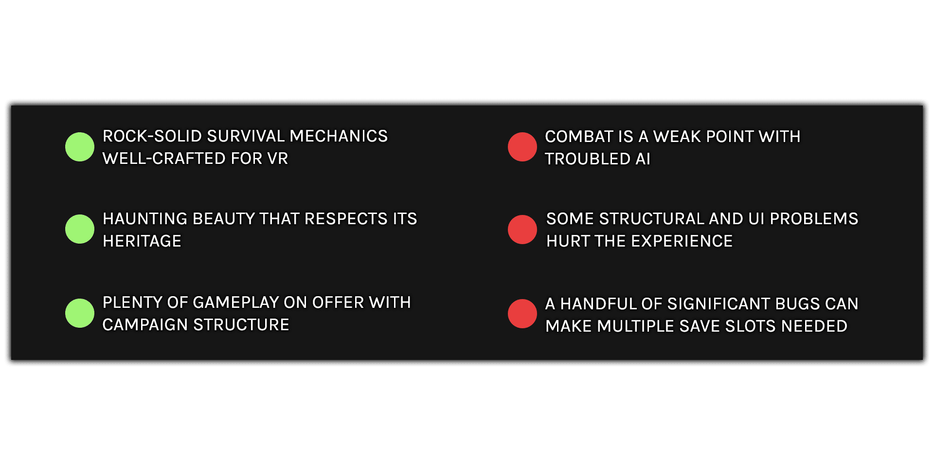 17-Bit’s VR debut has the depth of its flatscreen contemporaries with an understanding of what needs to change to make them work inside a headset. Song in the Smoke has aim and direction, giving players a series of areas to discover and complete objectives in (which are impressively big for a Oculus Quest) before moving on to the next and managing their energy and food supplies at the same time. Crucially, the laws of this jungle are tough and unforgiving but also don’t waste your time with antiquated UI or overly complex crafting, and it has its own ideas about how to expedite or enhance some of the genre’s more mundane elements for VR. The result is a uniquely assured gameplay experience.