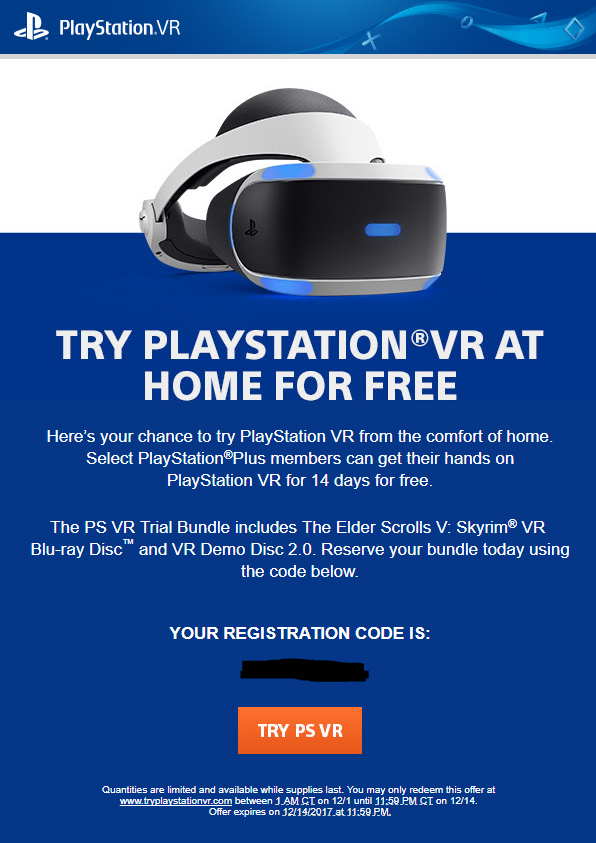 In a post-Black Friday world this is not something I expected to see today. Apparently, Sony is currently testing a PSVR “Trial Bundle” with select PlayStation Plus subscribers right now. If you were one of the lucky few chosen that signed up in time, you would have received a special promotional code in an email with a link to this website. After inputting your personal details and promo code, you’d reportedly be sent a PlayStation VR headset, PS Camera, two PS Move controllers, Skyrim VR, and the PSVR Demo Disc 2.o. Basically, you get a Skyrim PSVR bundle totally for free.