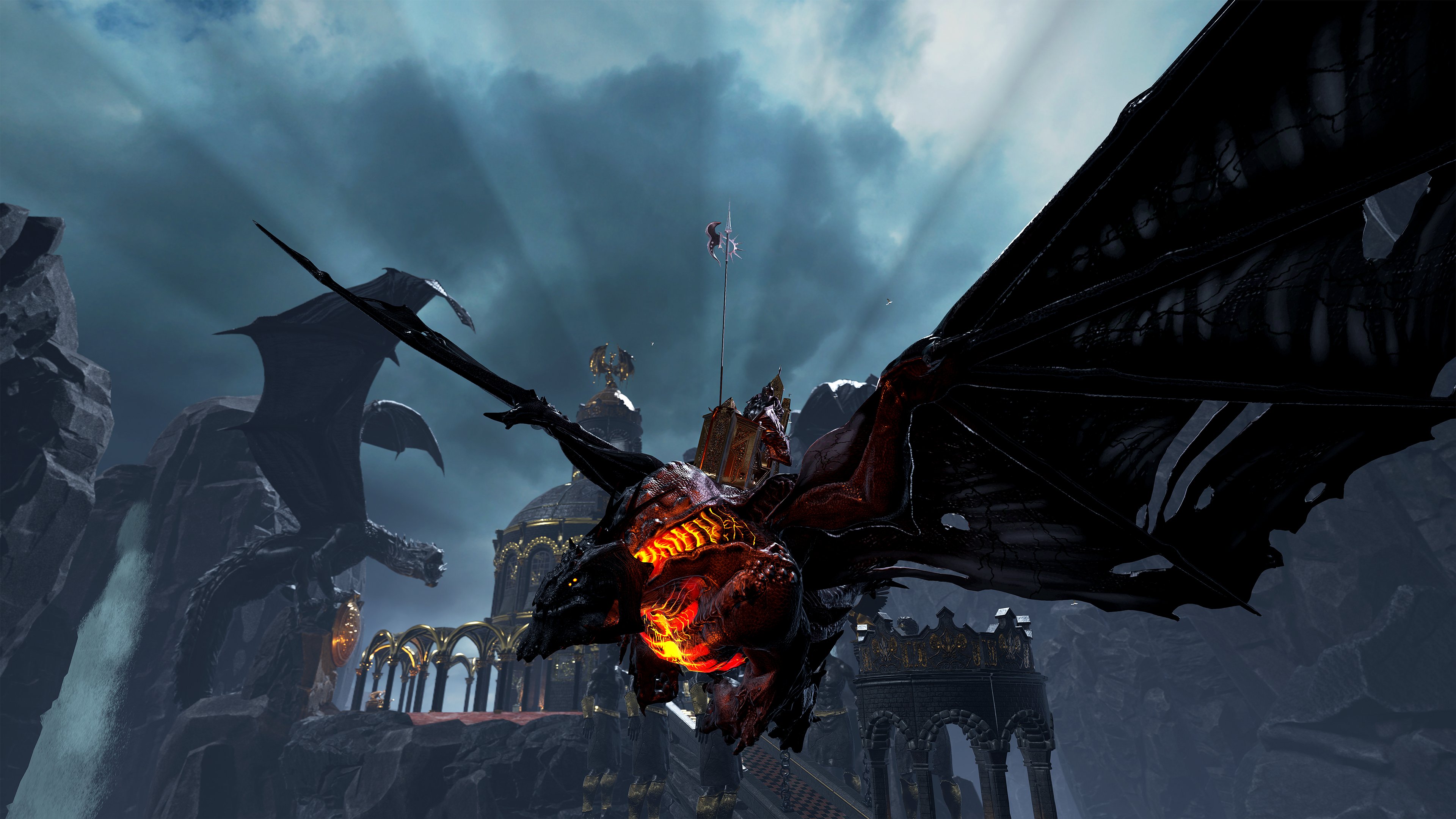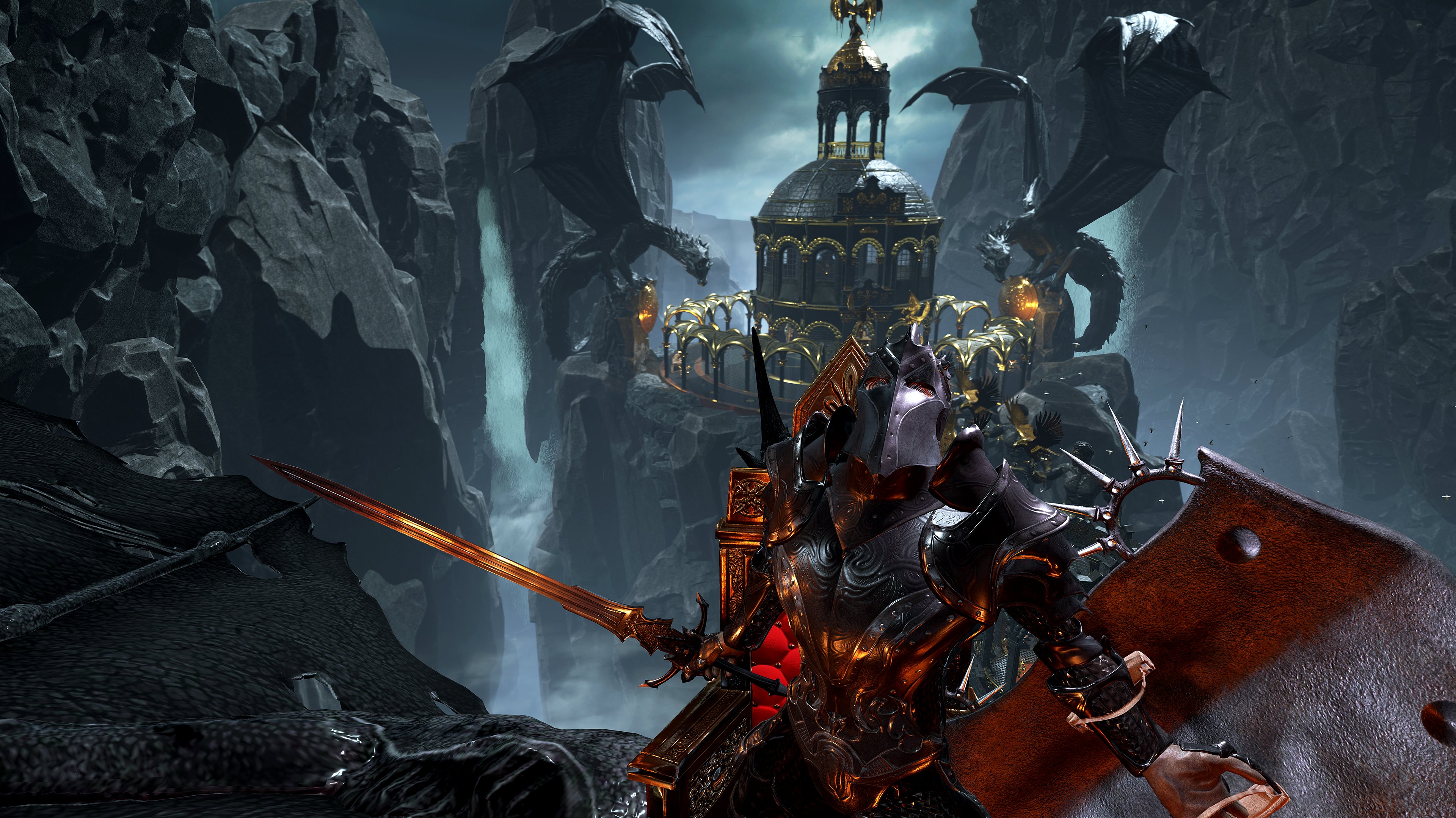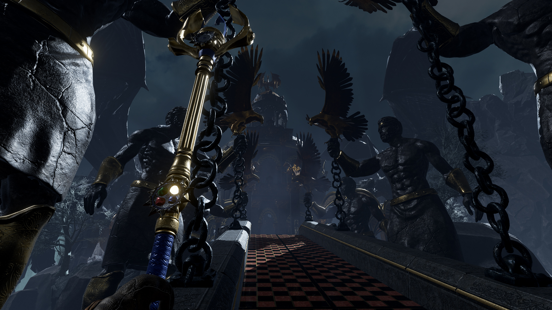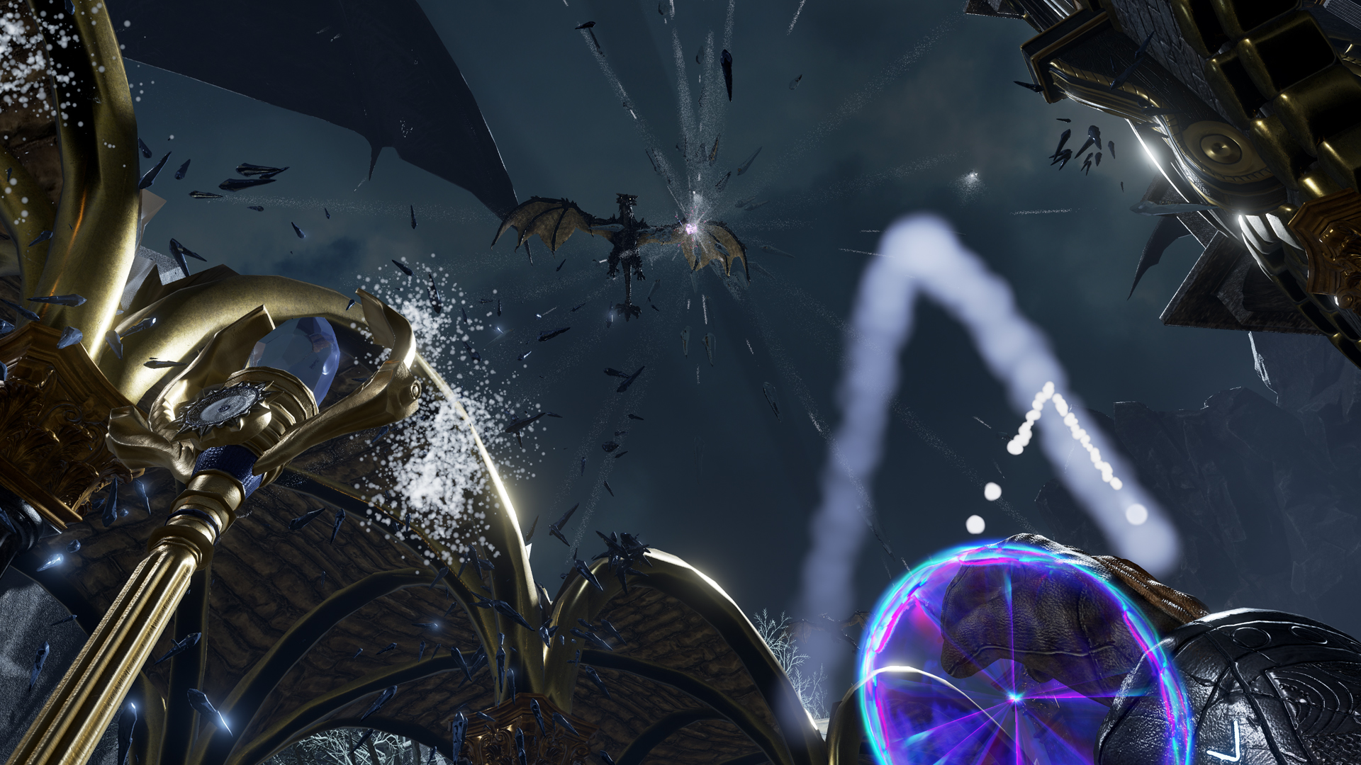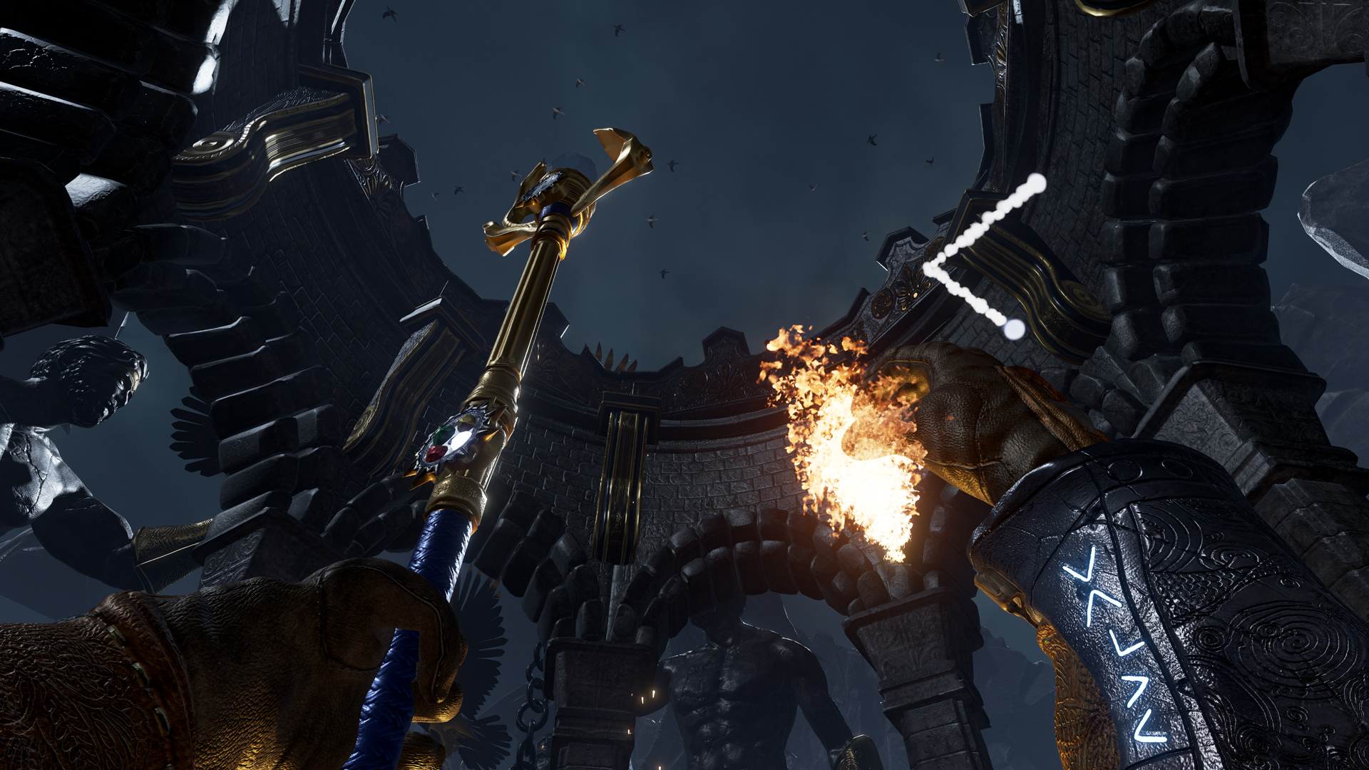 After I completed a simple puzzle and fought off a few enemies, the roof opened up with a mighty dragon and I was transported to a preview of a new environment, which you see in the featured image at the top of this article. The sky was dark and brooding, the cliffsides were steep and terrifying, and the massive statues were intimidating. This is the area that finally realizes the vision of a grand, immersive fantasy adventure that few VR games have accomplished thus far.