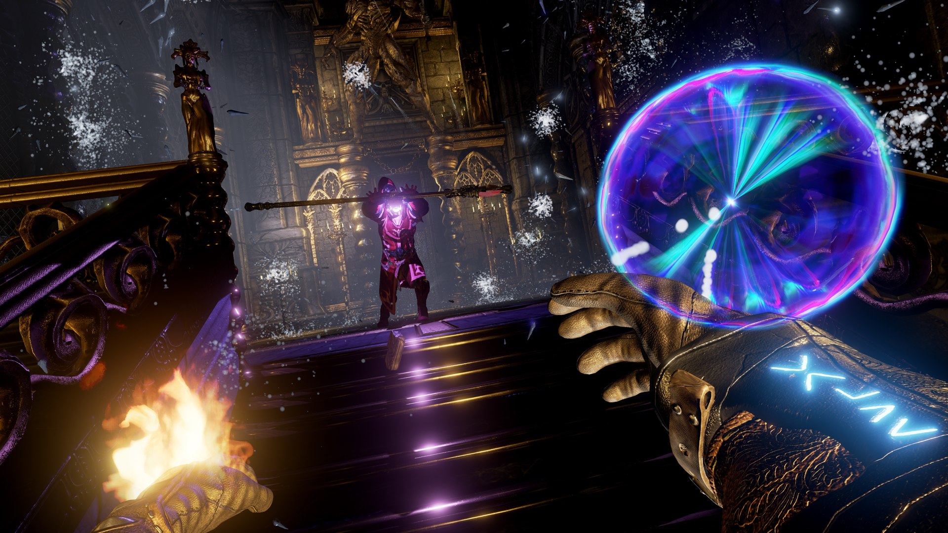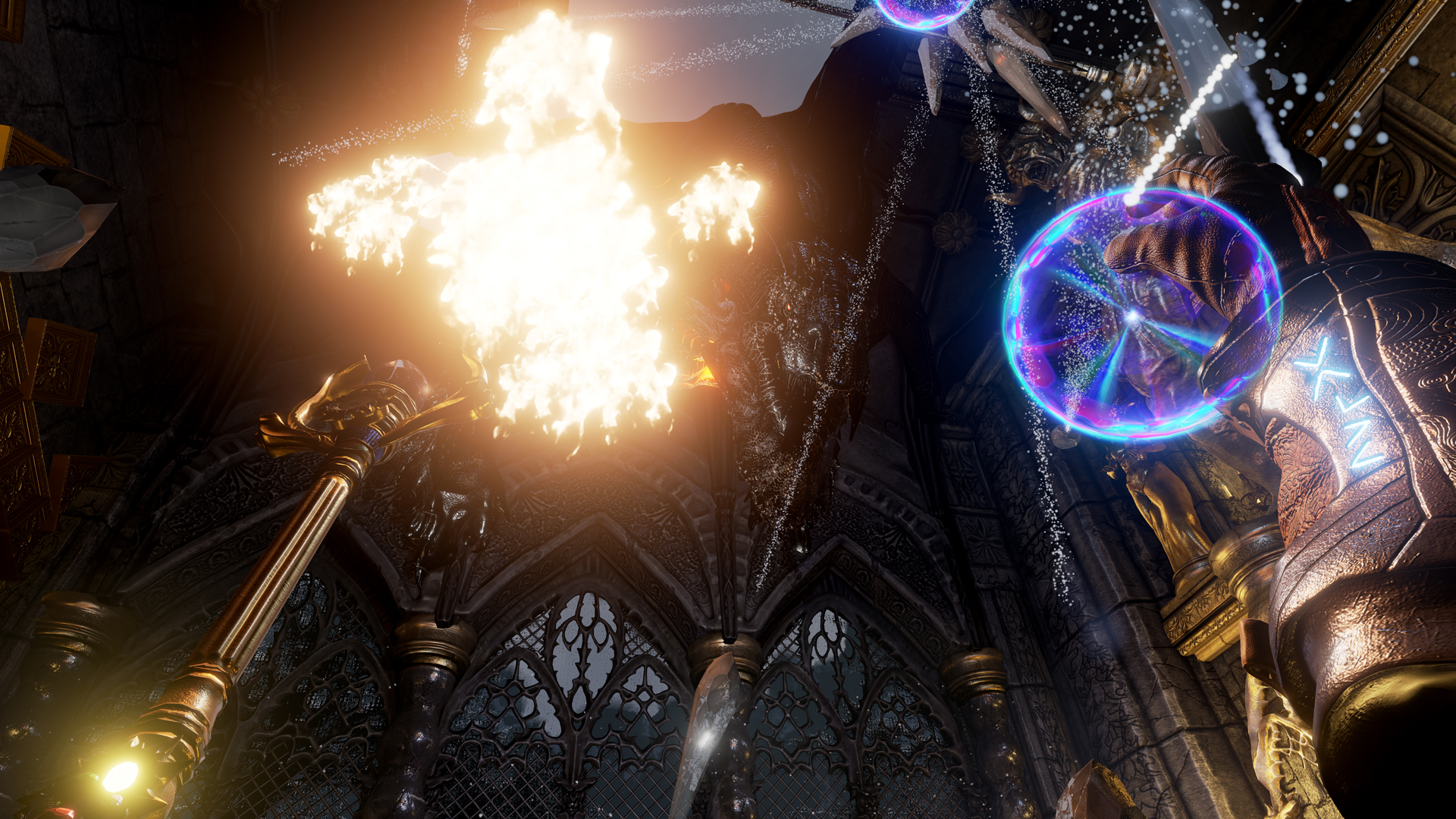 For starters, this new demo featured a much-needed tutorial section. It walked me through how to use my staff, sword, and spells. The staff is accessed by reaching over my left should with my left hand and pulling the trigger — similar to switching weapons in other games like Space Pirate Trainer. From here, I can tap (as in lightly touch my finger to different areas) on the touchpad to switch between the different abilities on the staff, such as a flamethrower, a teleportation spell, and an energy shield.