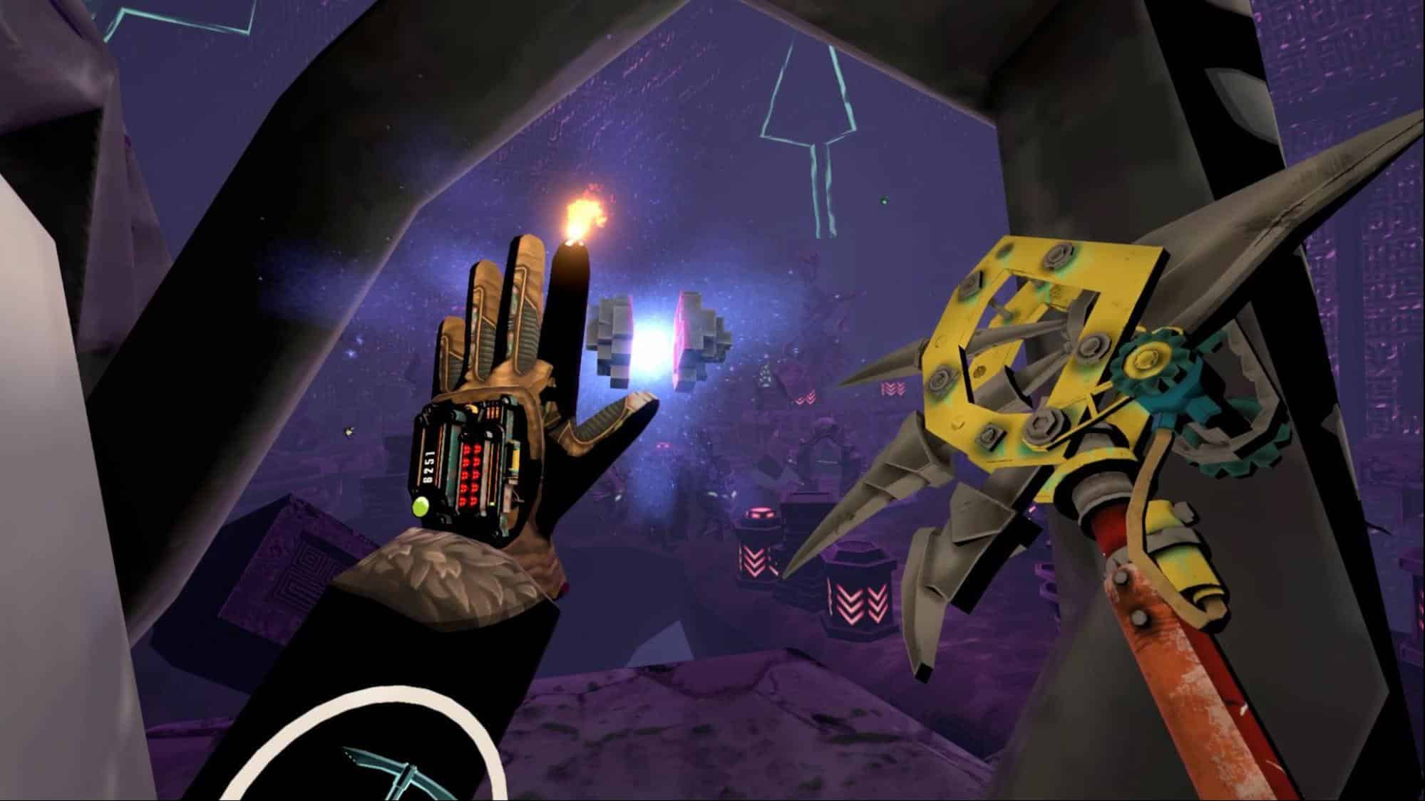 Each mining run consists of three procedurally generated floors. You will move between the floors in an elevator, and you always have the chance to go back up to the surface when you find one. You can secure loot to your backpack by dropping the item behind your back at around head height, like you would carry an open backpack ready to drop the loot to. When a backpack gets full it automatically starts to filter out the least precious loot as you secure more valuable items. So even with a full backpack, it might be a better idea to just continue to descend deeper for more rare findings, unless you’re in low health. You can check your health and backpack status among other things from your handy glove.