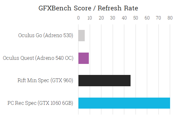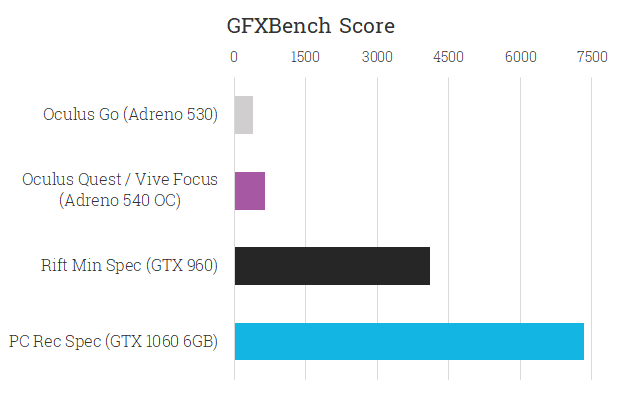 As you can see, the GPU differences between standalone and PC are far greater than the CPU- only around 15% of even the Rift’s minimum spec GPU. This is where developers will have the most trouble- mobile GPUs simply do not compare to the multi-hundred-watt beasts from NVIDIA and AMD in our PCs.